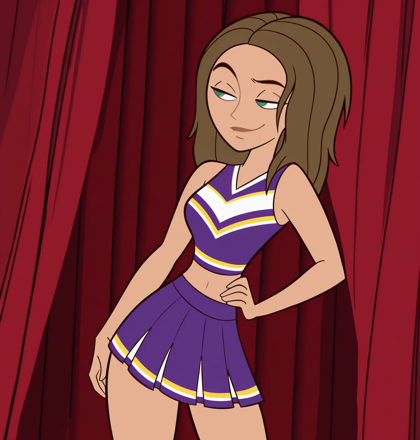 Bonnie Rockwaller: bonnie rockwaller, 1girl, solo, green eyes, aqua eyes, breasts, brown hair, medium hair, shirt, skirt, bare shoulders, small breasts, sleeveless, midriff, miniskirt, crop top, lips, thighs, sleeveless shirt, purple skirt, purple shirt, cheerleader, solid eyes