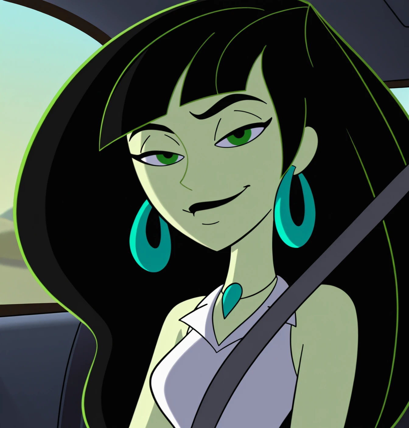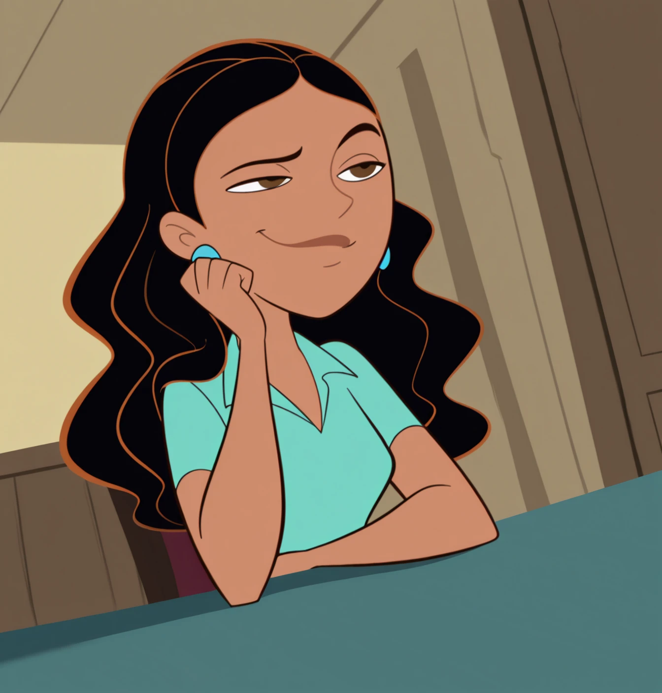 Monique: (monique \(kim possible\)), 1girl, solo, long hair, smile, shirt, black hair, jewelry, brown eyes, upper body, short sleeves, earrings, collared shirt, dark skin, dark-skinned female, wavy hair, parted bangs, blue shirt, aqua shirt, hair slicked back