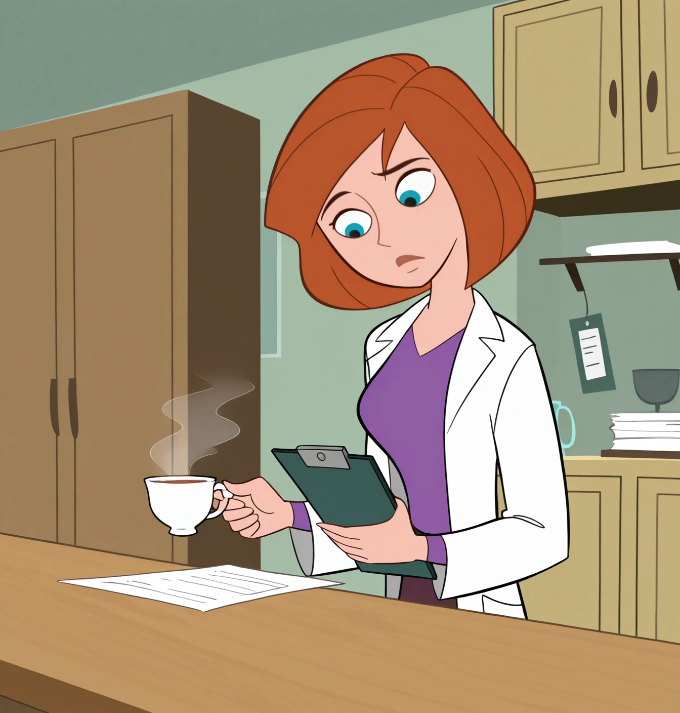 Ann Possible: (ann possible), 1girl, solo, medium breasts, short hair, blue eyes, shirt, brown hair, red hair, purple shirt, long sleeves, orange hair, lab coat