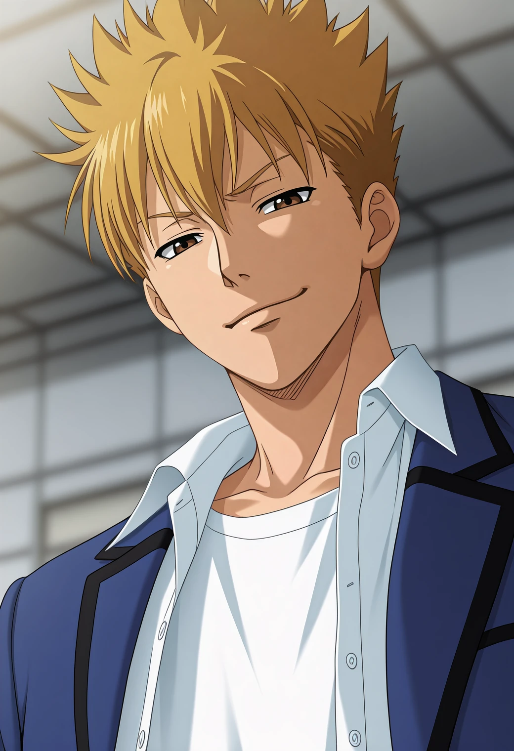 f4r4sh1_uniform,blue jacket,white collared shirt,open clothes,white t-shirt, - Tags for replicating his school look!