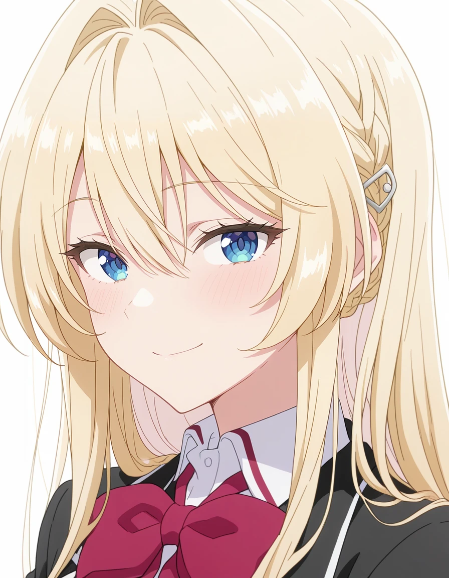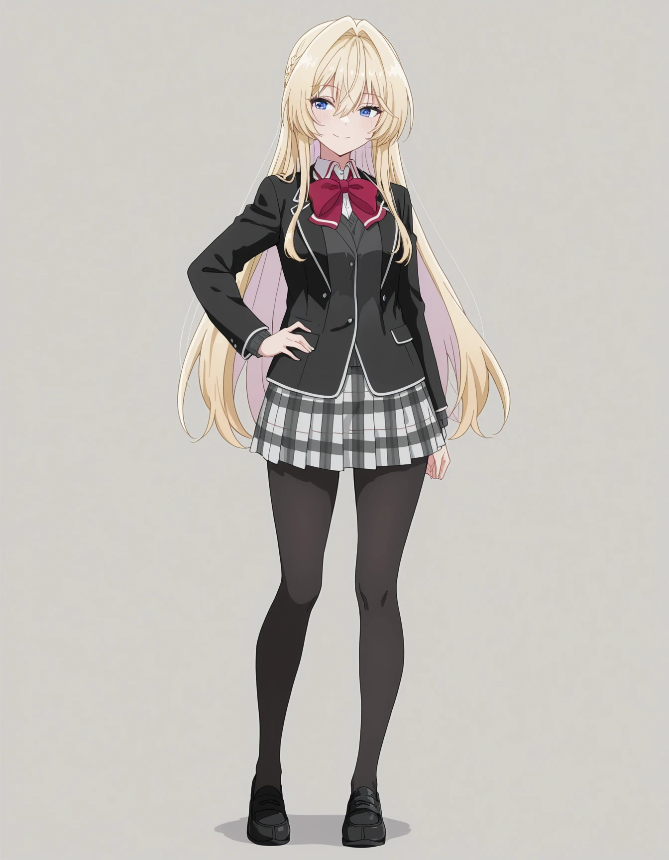 mai_oduka,long_hair,french_braid,blonde_hair,hair_between_eyes,blue_eyes,school_uniform,black_jacket,red_bowtie,plaid_skirt,pantyhose,loafersRecommend preferred Strength: 0.7~1.