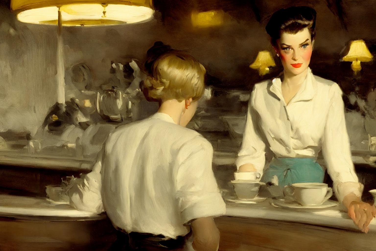 a painting, by {artist}; a {subject}, {description of what the subject is wearing/doing}; a {another subject}, {description of what that subject is wearing/doing}; ... {info about the background or setting}; {genre tag and other important keywords}