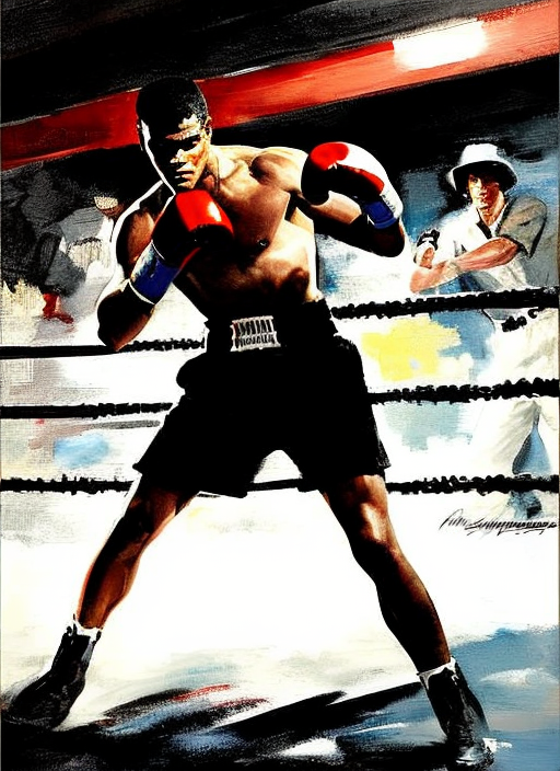 a painting, by Robert Maguire; a boxer, standing in the ring; dramatic lighting, action
