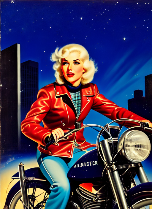 a painting, by George Gross; a woman, sitting on a motorcycle; at night, in the city, masterpiece, HQ