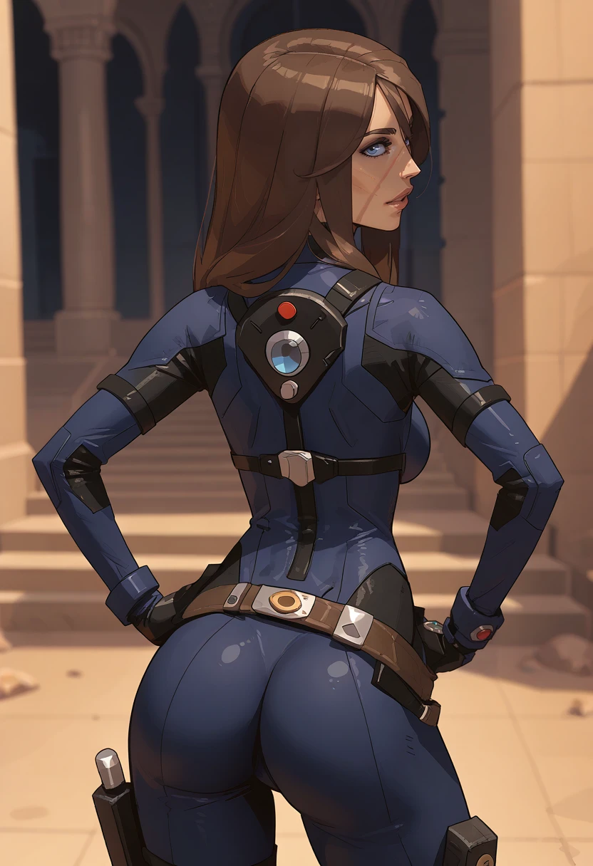 1girl, solo, breasts, lips, face scar, blue eyes, brown hair, hair between eyes, long hair, large breasts, dark-skinned female, dark skin, bodysuit, impossible clothes, belt,