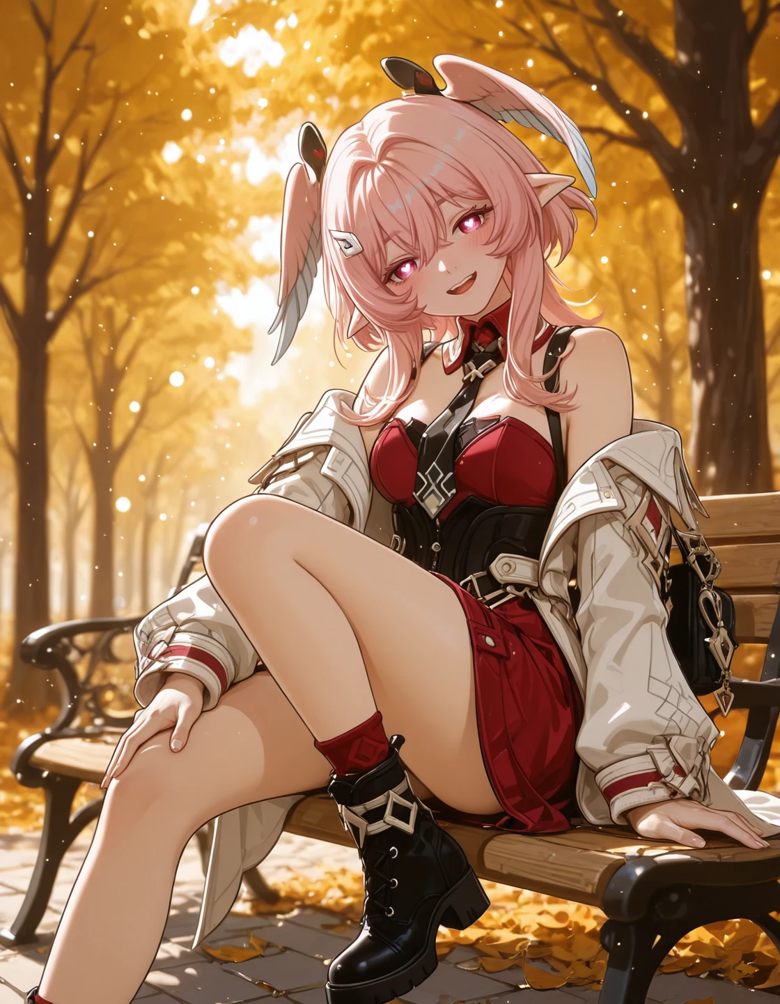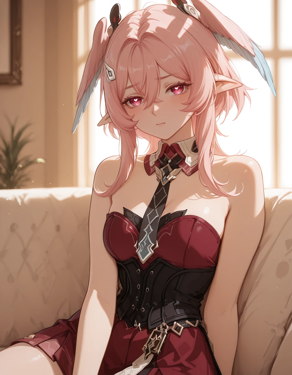 Character: linnea_gi, pink hair, pink eyes, heart-shaped pupils, short hair with long locks, crossed bangs, sidelocks, pointy ears, head wings, wing hair ornament,