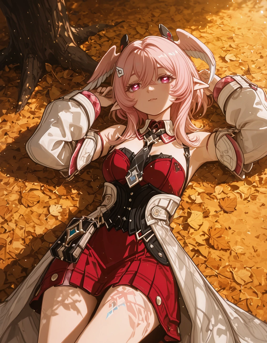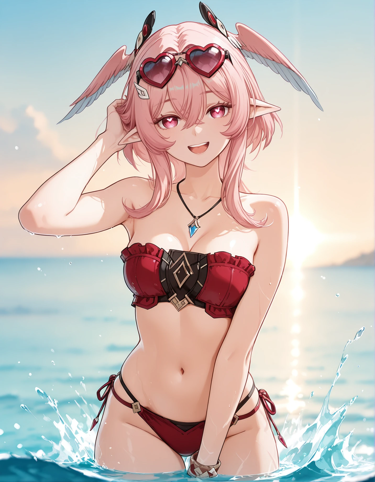 linnea_gi, pink hair, pink eyes, heart-shaped pupils, short hair with long locks, crossed bangs, sidelocks, pointy ears, head wings, wing hair ornament
