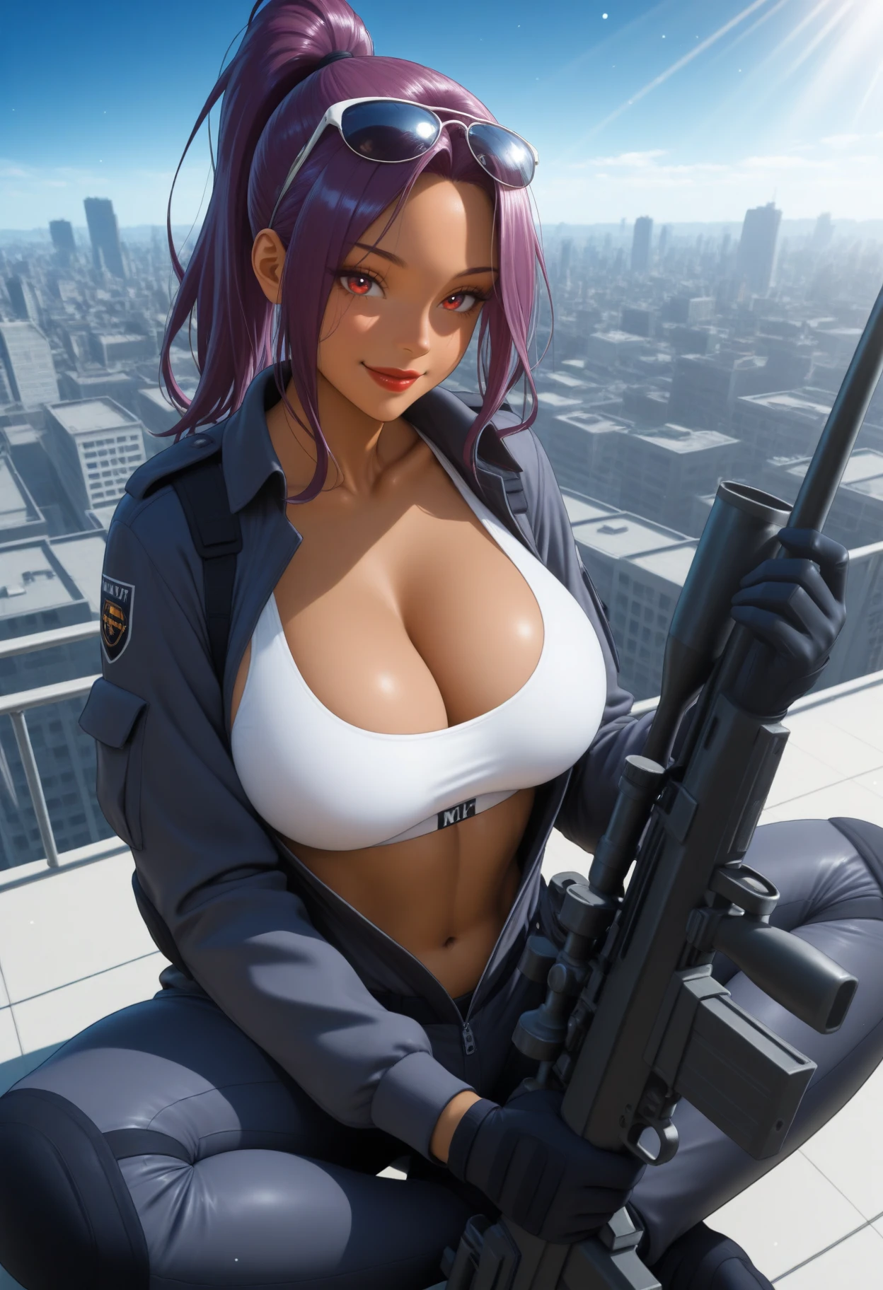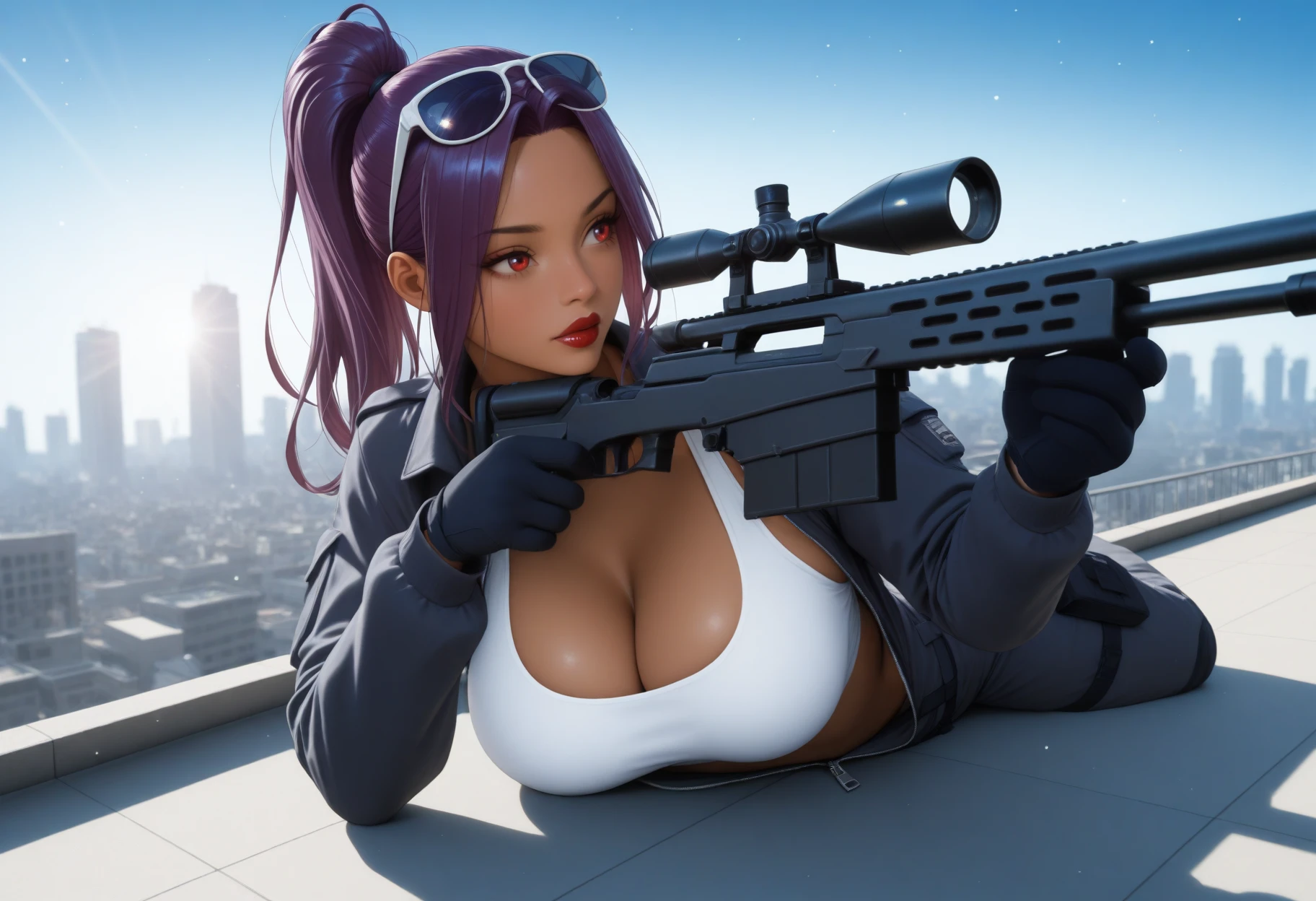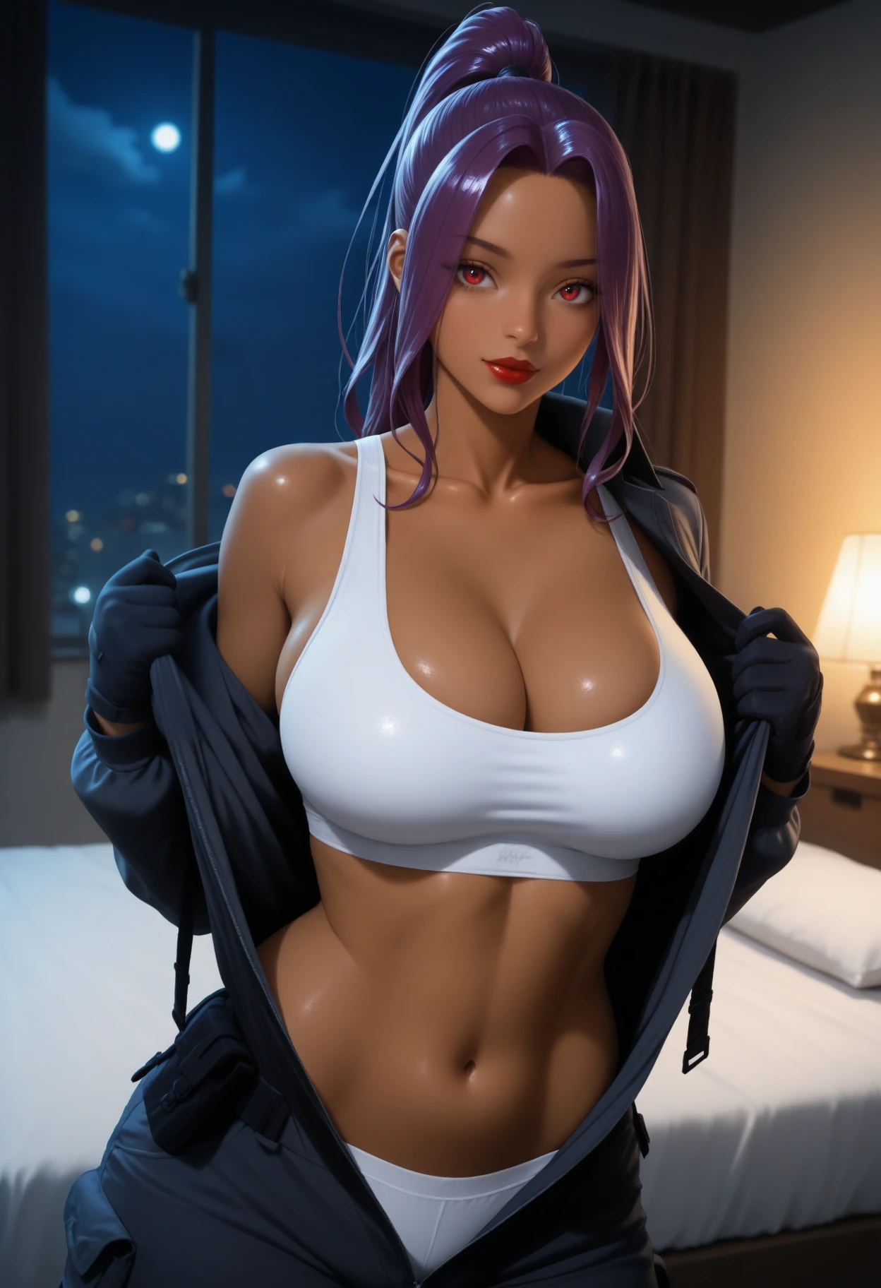 Main Prompt: dark-skinned female, curvy, long hair, purple hair, high ponytail, parted bangs, red eyes, red lips, large breasts,