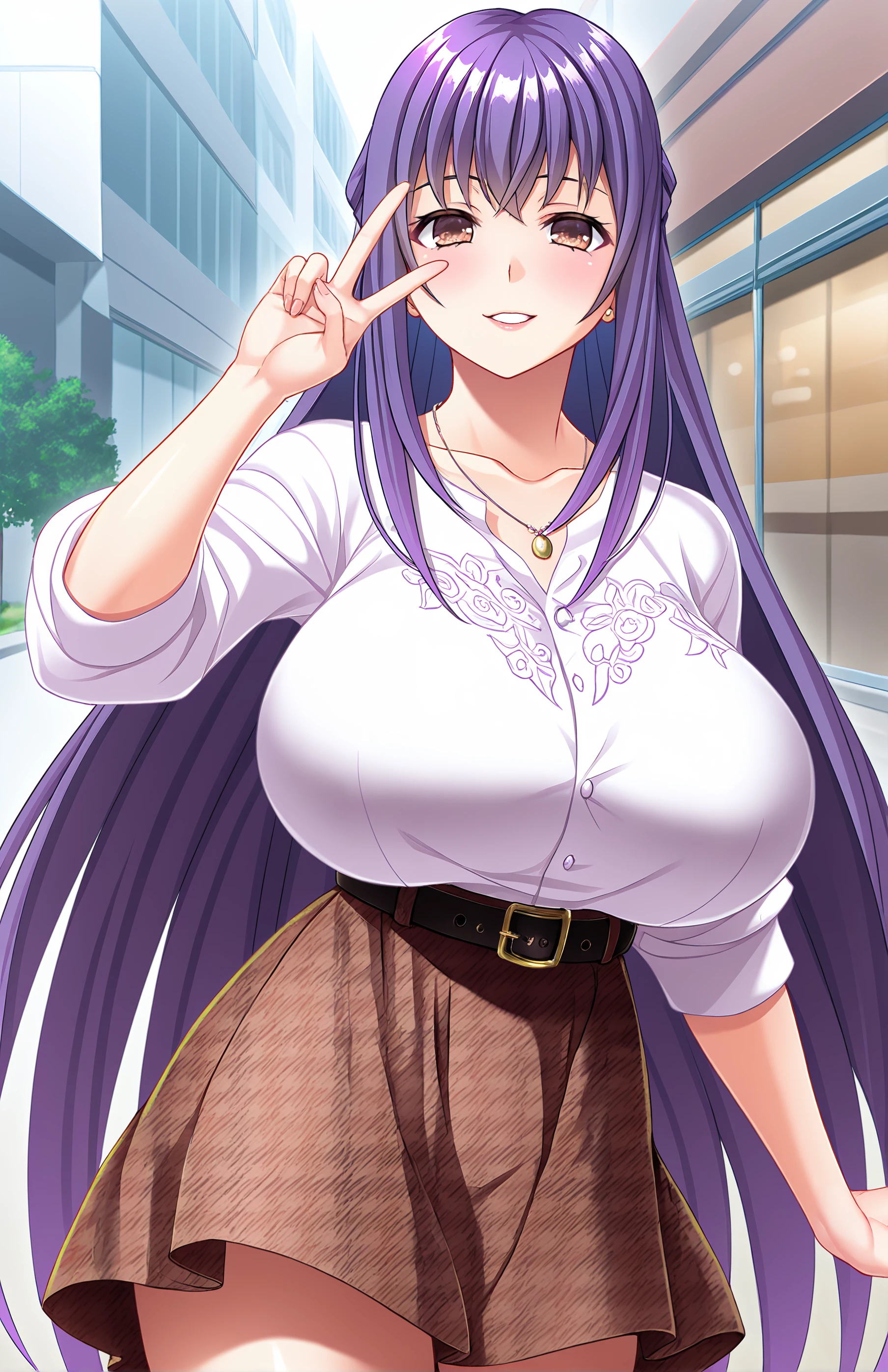 IsoyamaKana, long hair, , bangs, skirt, , shirt, brown eyes, jewelry, very long hair, collarbone, white shirt, purple hair, belt, necklace, , brown skirt, plaid skirt, shirt tucked in