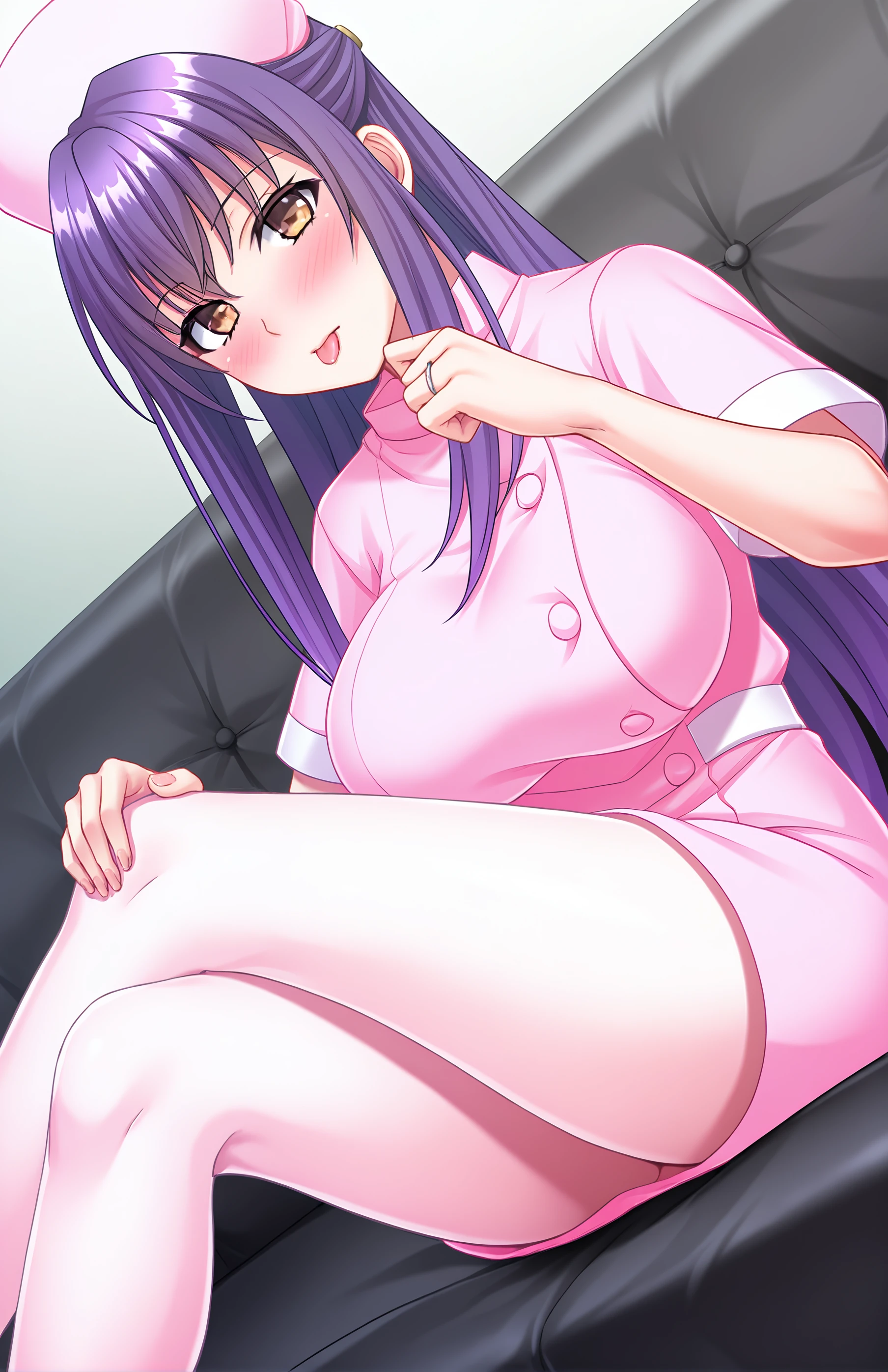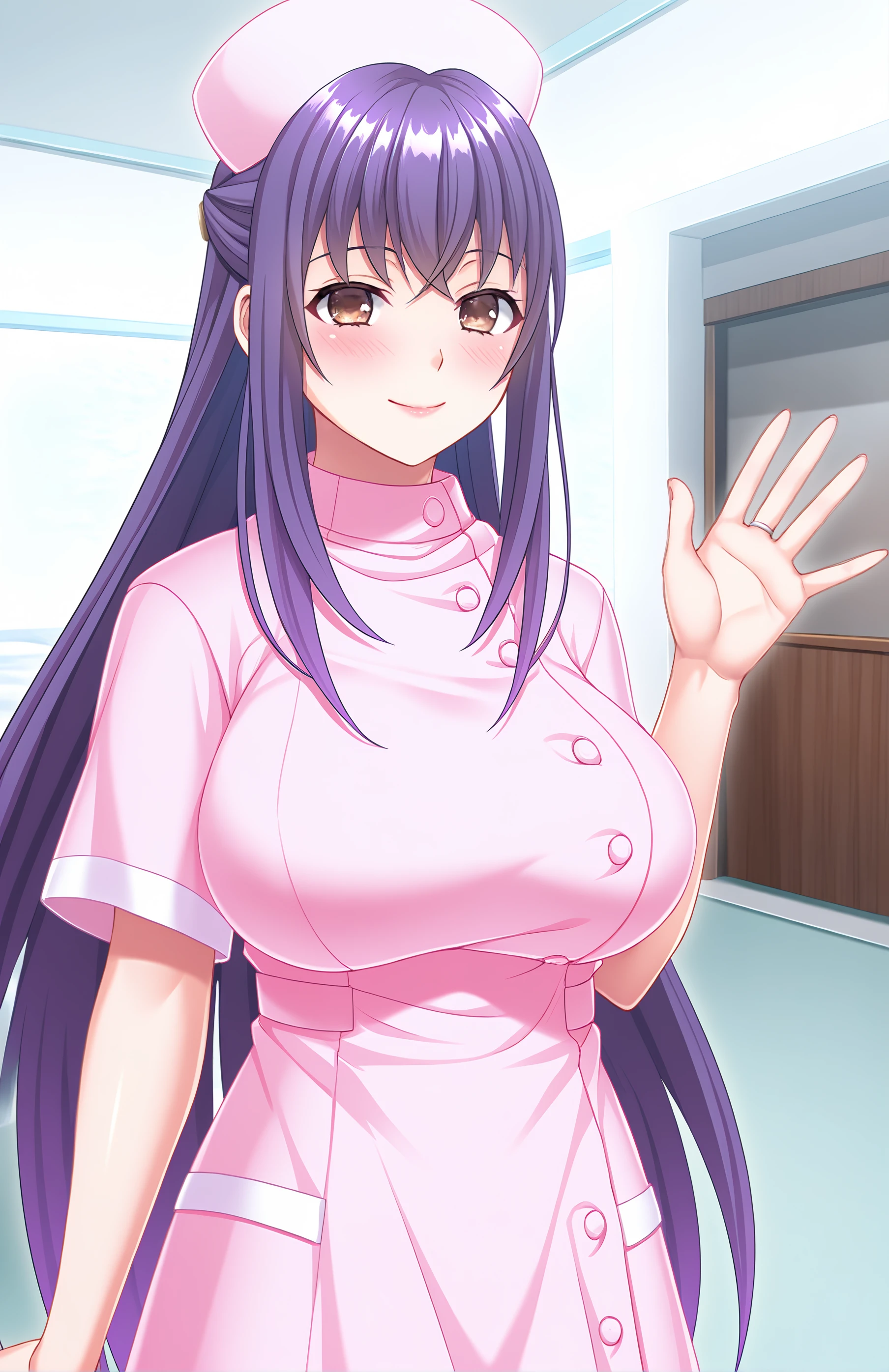 IsoyamaKana, long hair, , bangs, , hat, dress, brown eyes, jewelry, purple hair, short sleeves, nurse cap, nurse