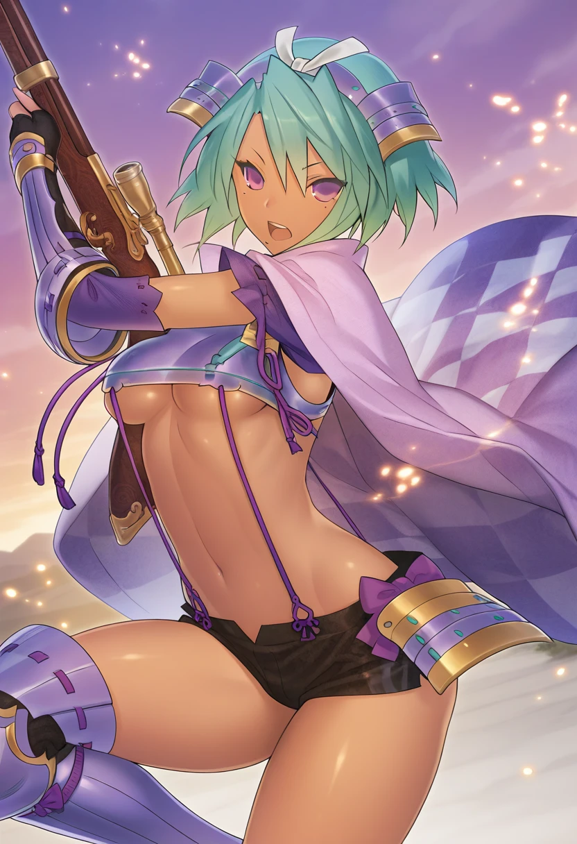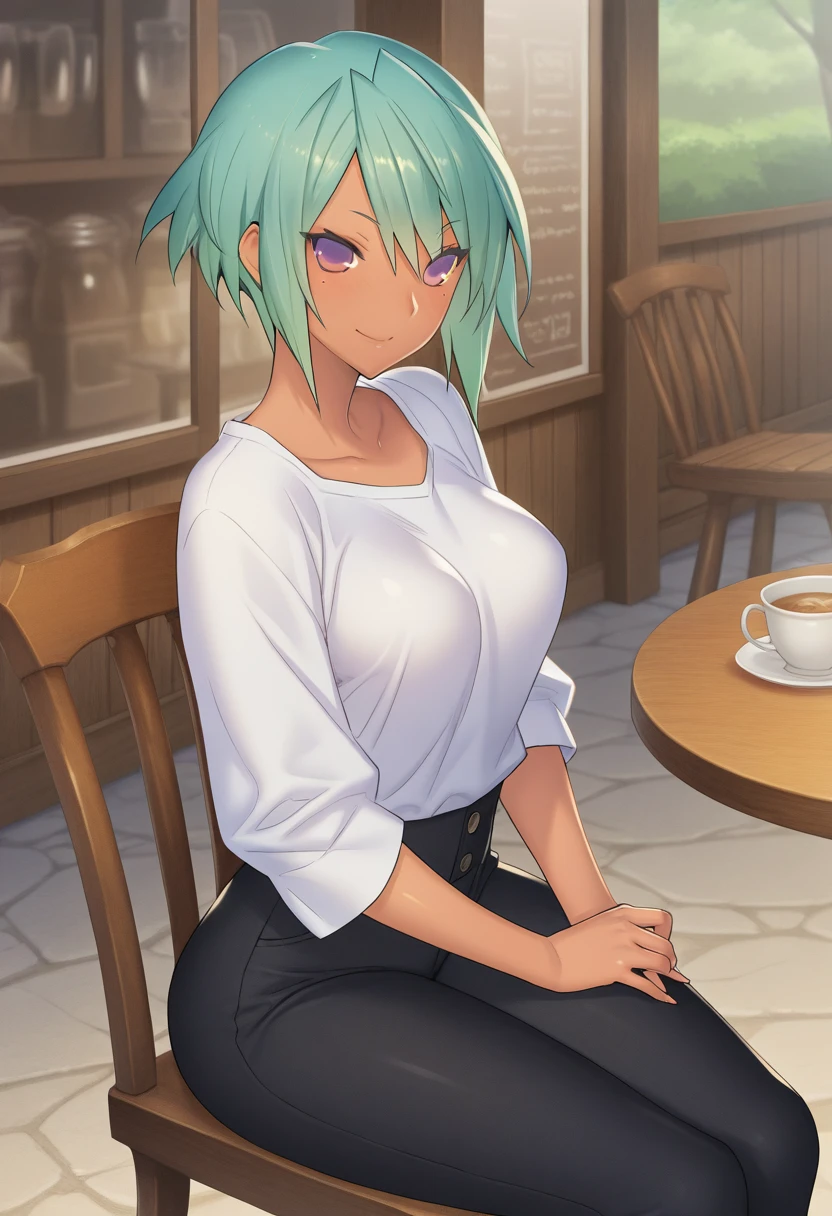 chikanori_muramasa, green hair, short hair, purple eyes, medium breasts