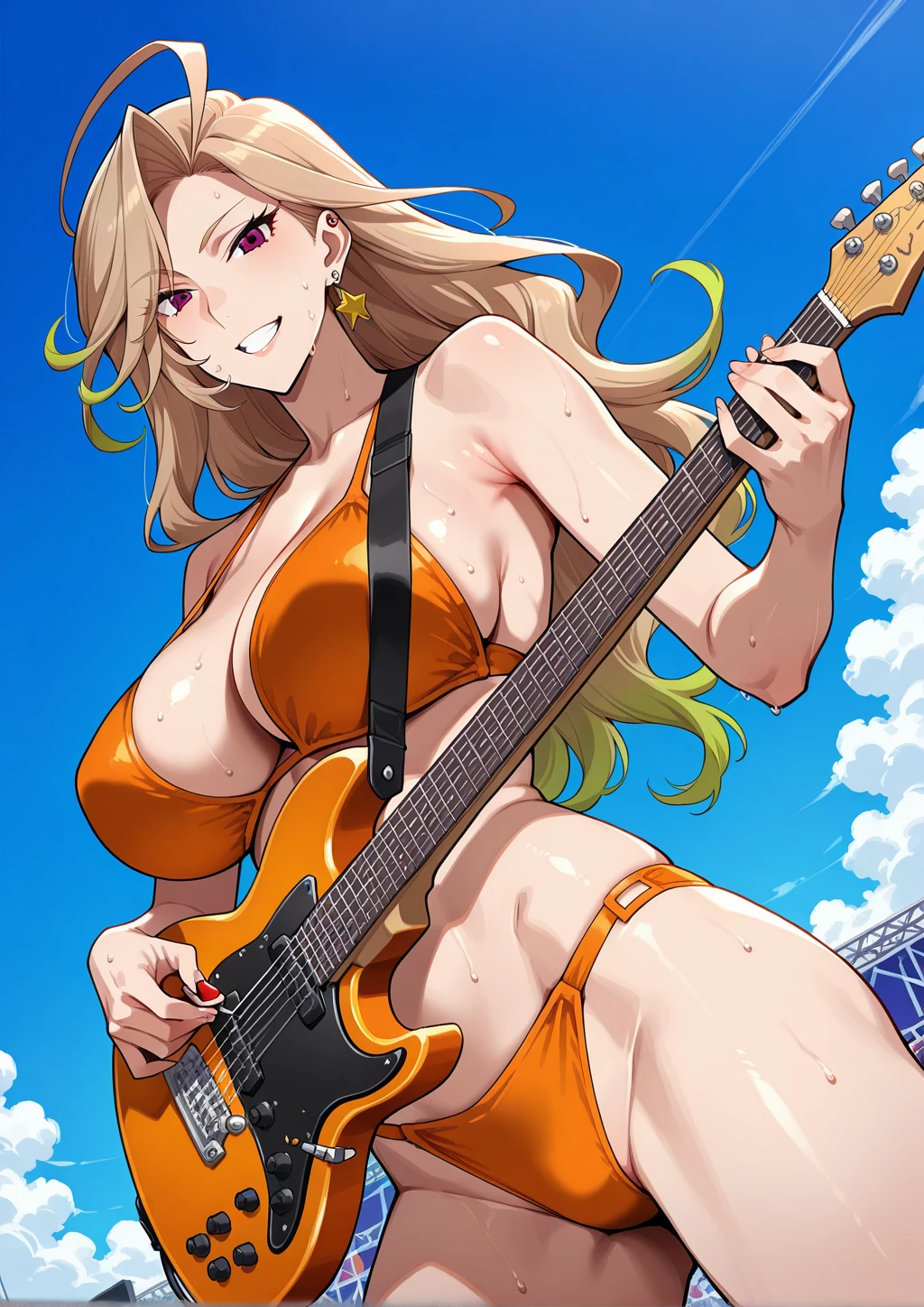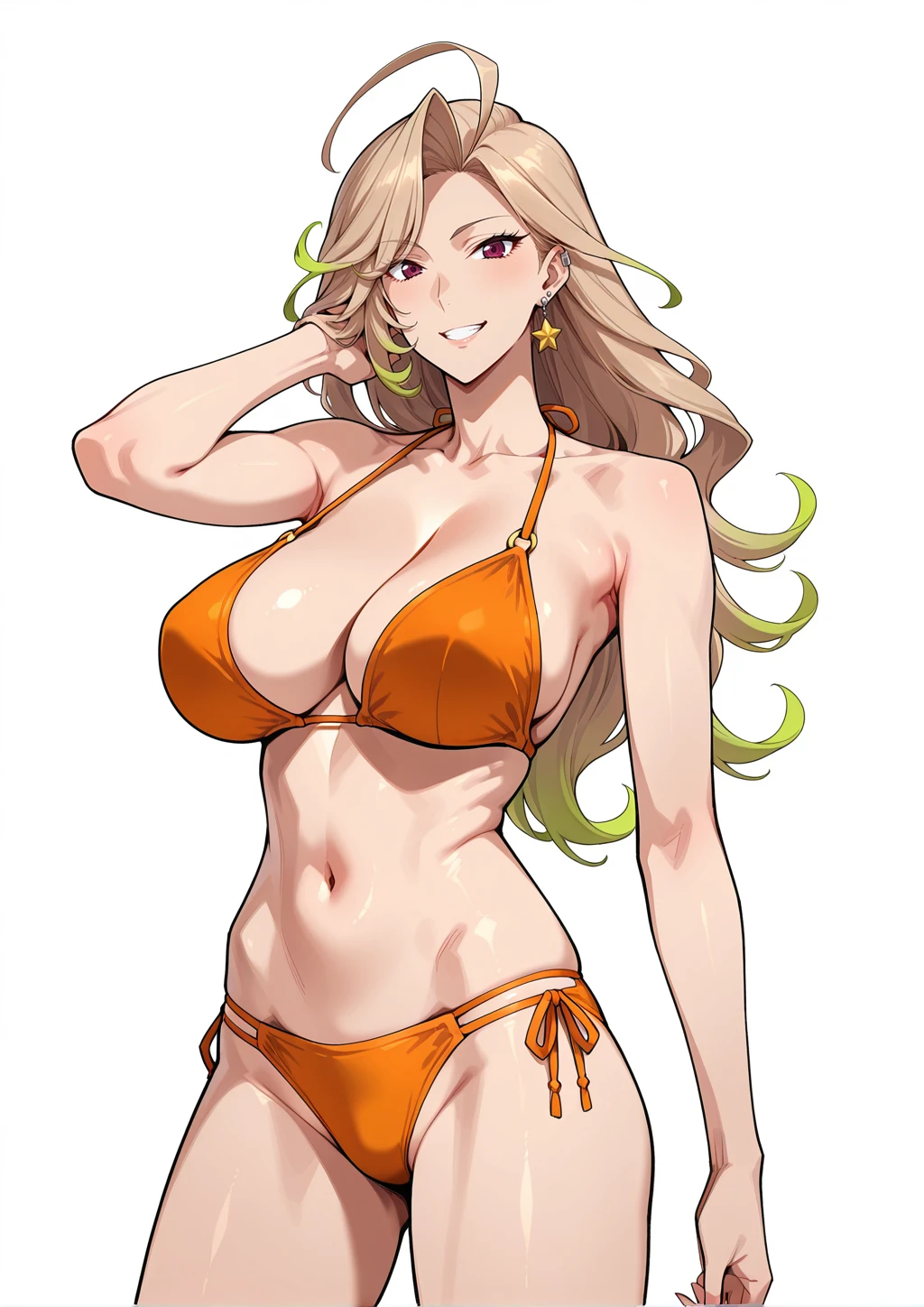 nagato_natsumi, 1girl, gradient hair, blonde and green hair, long hair, wavy hair, asymmetrical bangs, flipped bangs, ahoge, ear piercing, single star shaped earring, earclip, purple eyes, tsurime, orange kagekidan_uniform, black collar jacket, wide sleeves, yellow string tie, purple shoulder harness, white high neck shirt, black vest, half gloves, white pantyhose, black knee boots, yellow tasselDescription