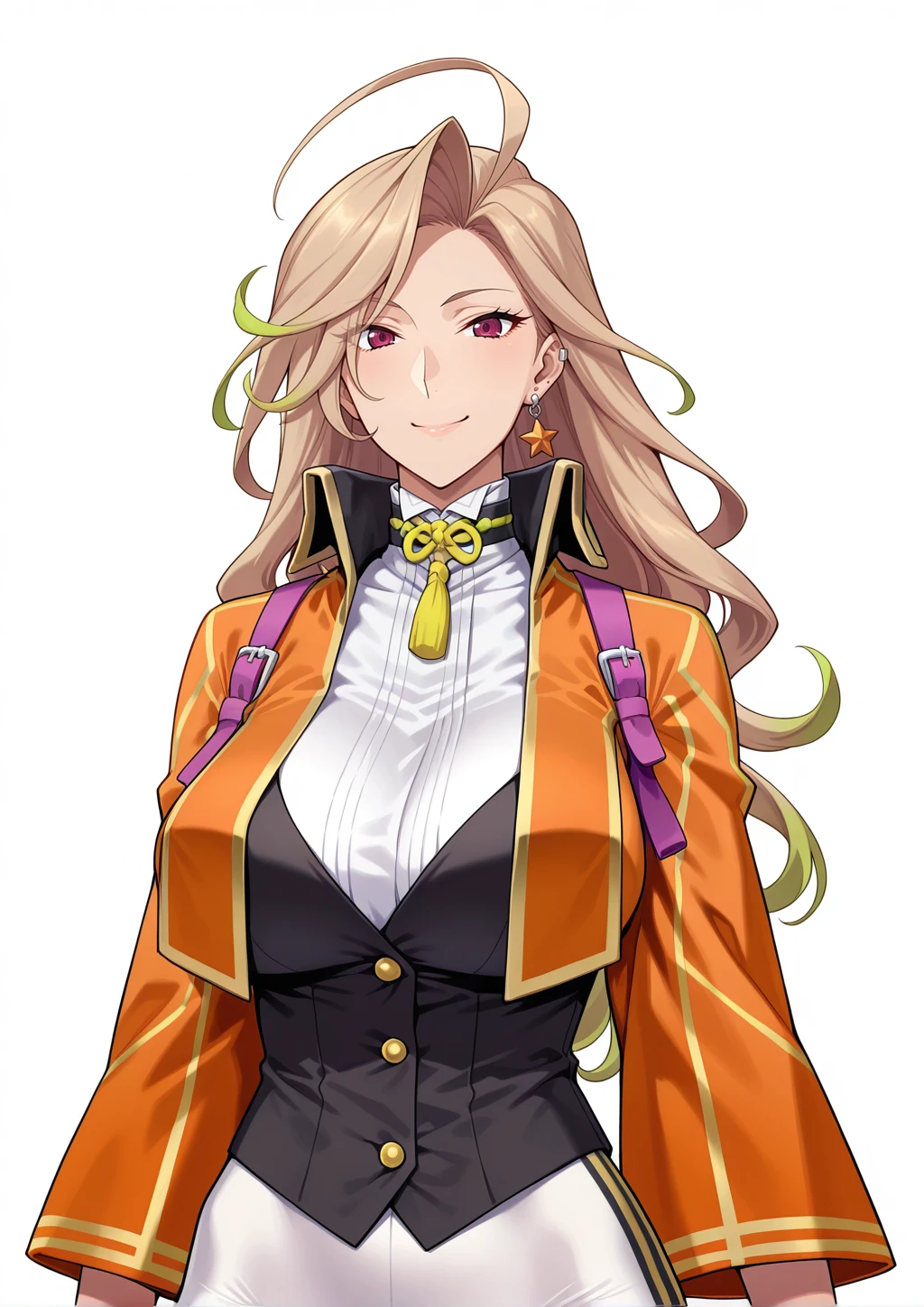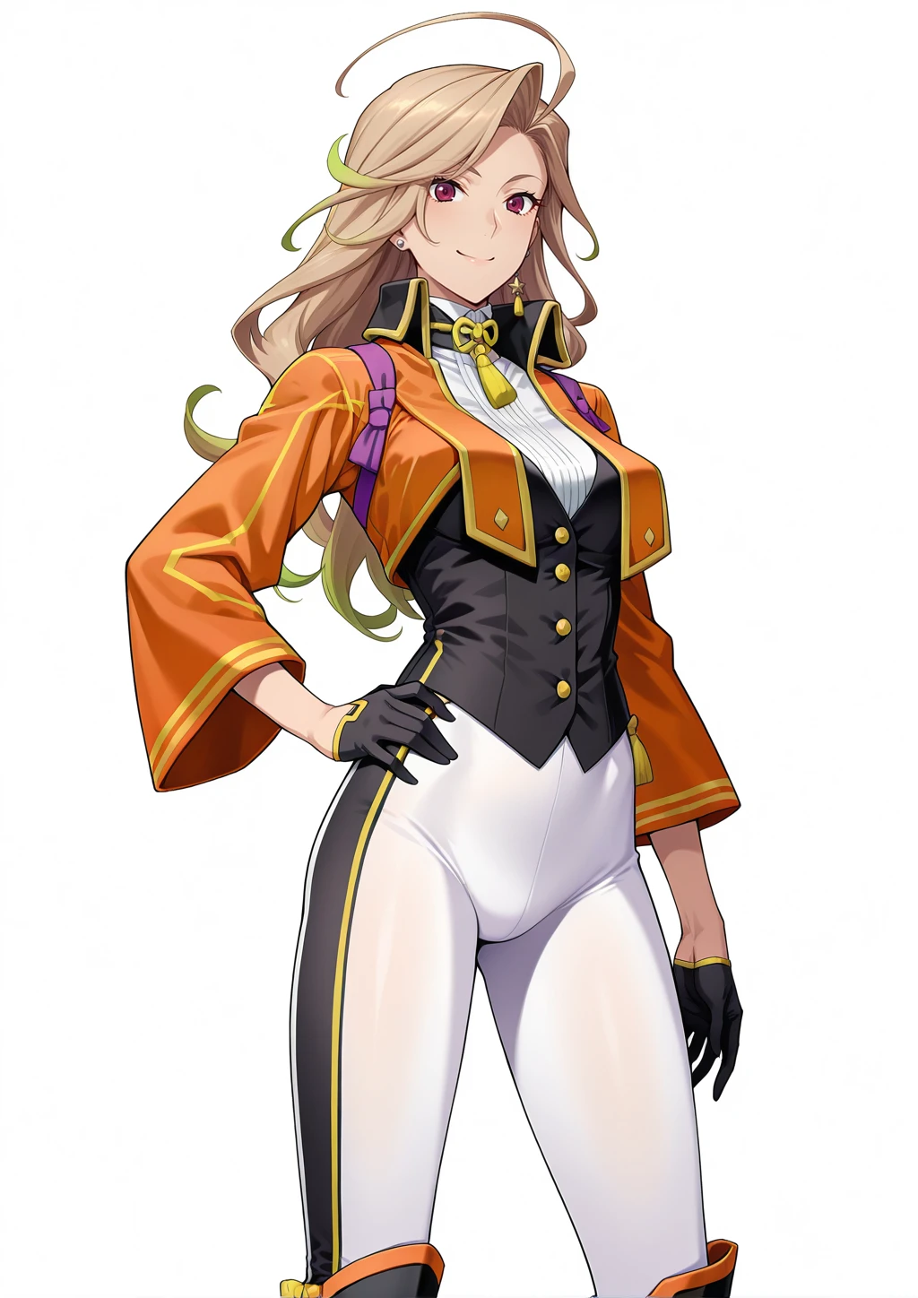nagato_natsumi, 1girl, gradient hair, blonde and green hair, long hair, wavy hair, asymmetrical bangs, flipped bangs, ahoge, ear piercing, single star shaped earring, earclip, purple eyes, tsurime, orange kagekidan_uniform, black collar jacket, wide sleeves, yellow string tie, purple shoulder harness, white high neck shirt, black vest, half gloves, white pantyhose, black knee boots, yellow tassel