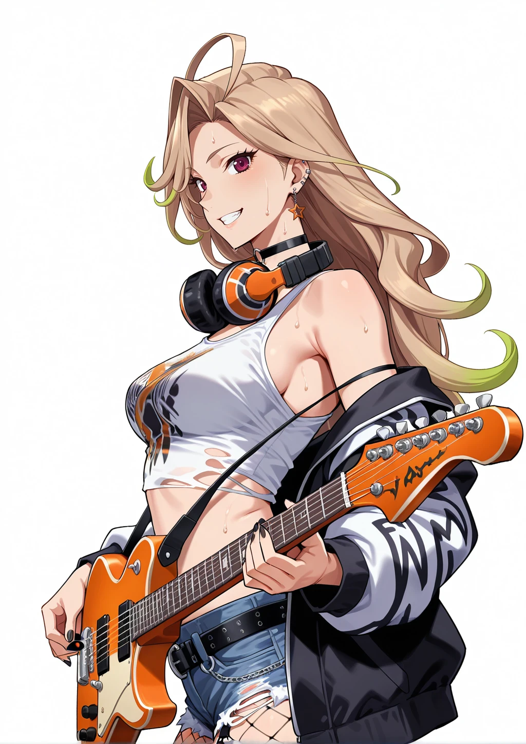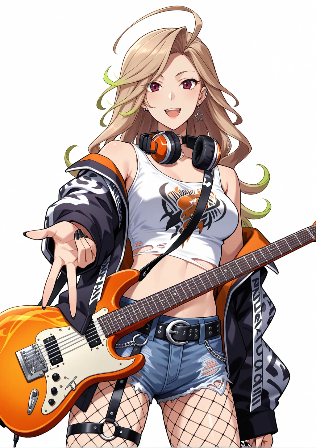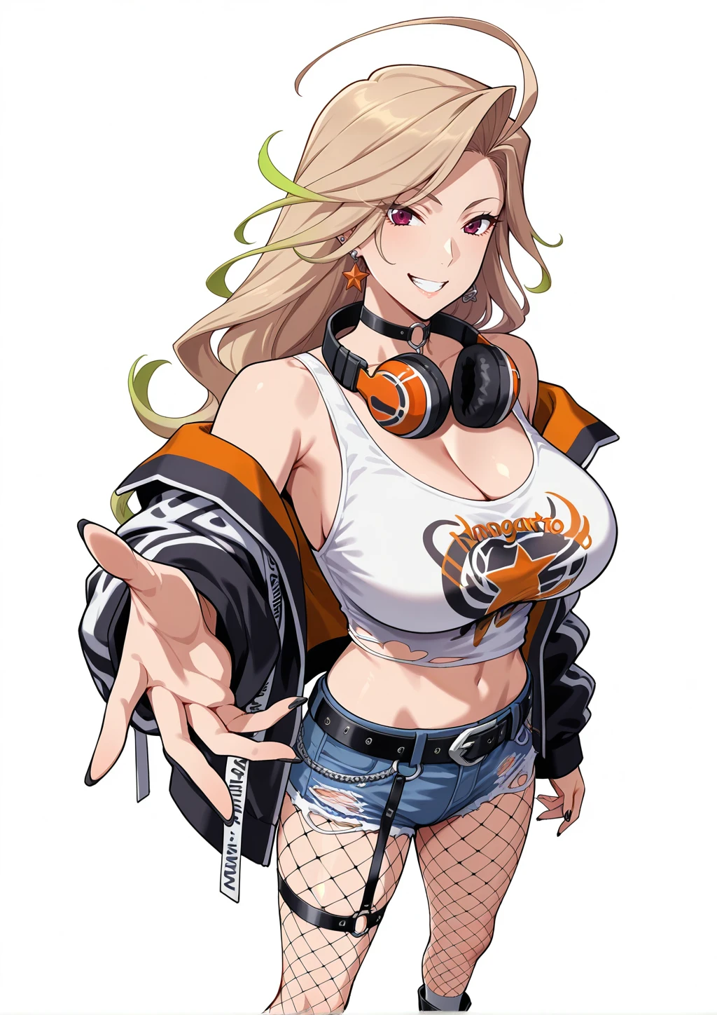 nagato_natsumi, 1girl, gradient hair, blonde and green hair, long hair, wavy hair, asymmetrical bangs, flipped bangs, ahoge, ear piercing, single star shaped earring, earclip, purple eyes, tsurime, black nails, o-ring choker, headphones around neck, white crop top, print tank top, torn shirt, jacket, jacket with shoulder tab, bare shoulders, denim short shorts, black leather belt, thigh strap, fishnet pantyhose, grey socks, black boots