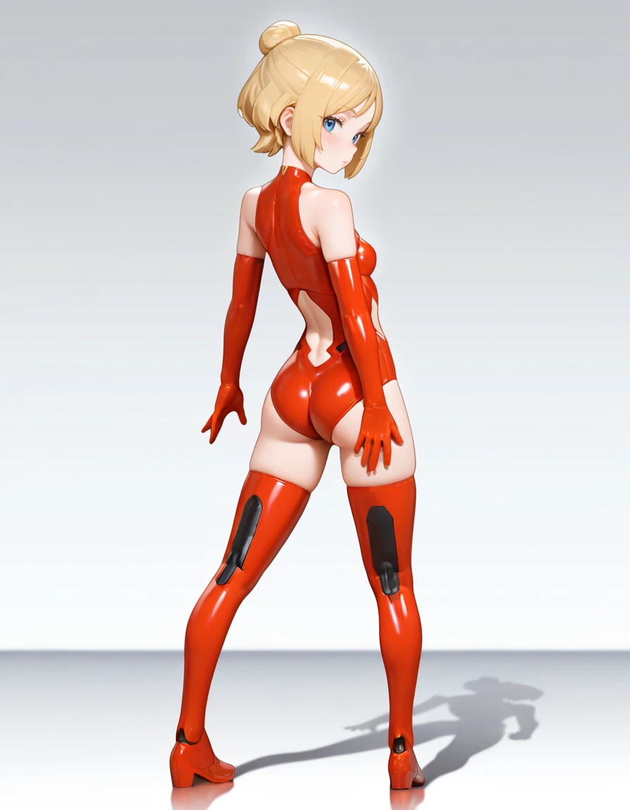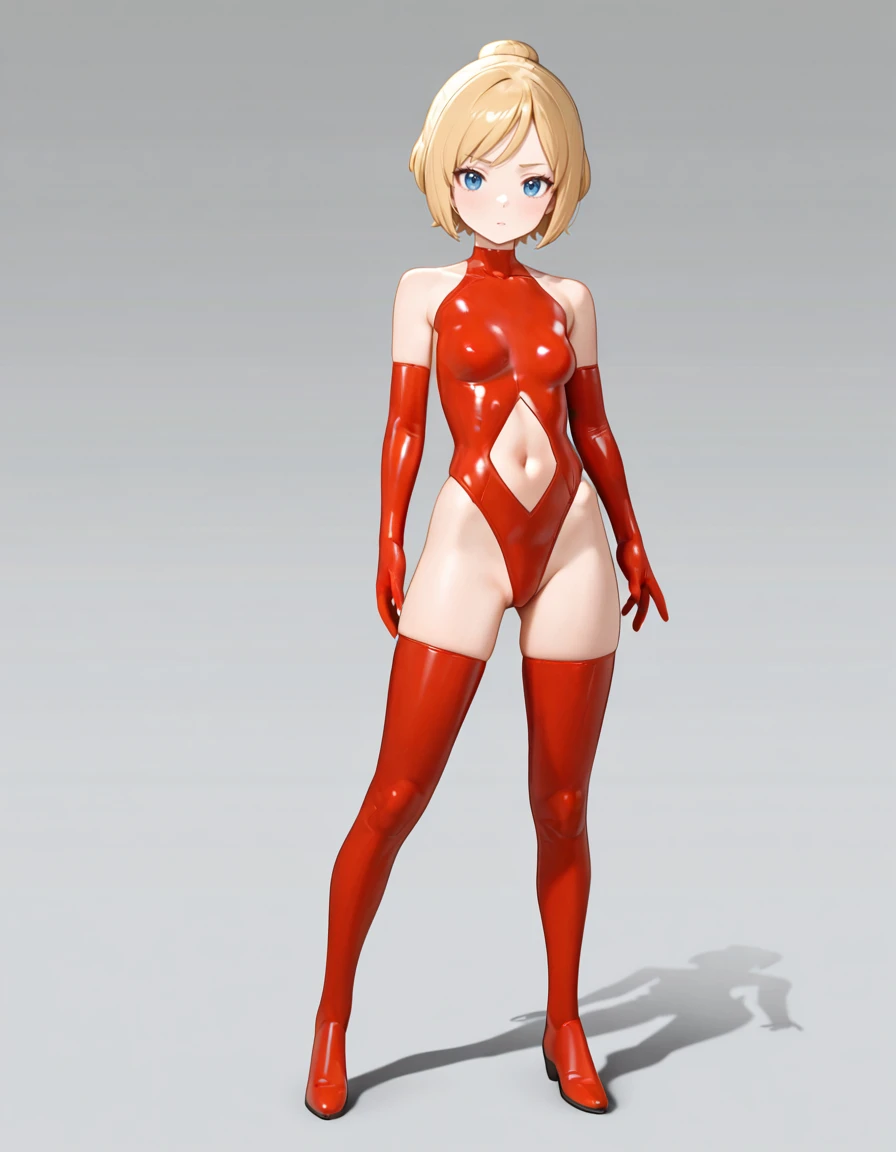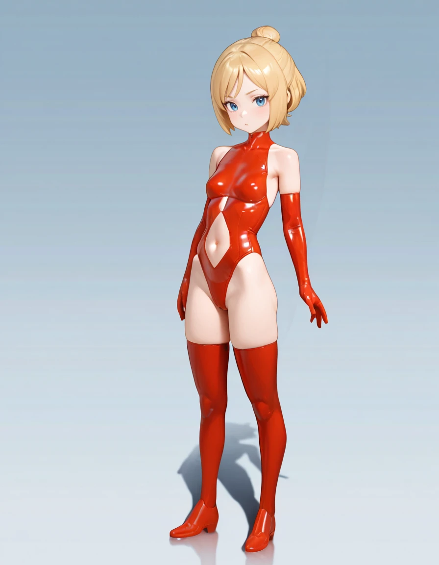 sol_hornet_Illustrious, bare shoulders, blonde hair, blue eyes, bodysuit, boots, clothing cutout, elbow gloves, gloves, hair bun, latex, leotard, navel cutout, red footwear, red gloves, red leotard, red thighhighs, science fiction, short hair, single hair bun, small breasts, thigh boots, thighhighs,