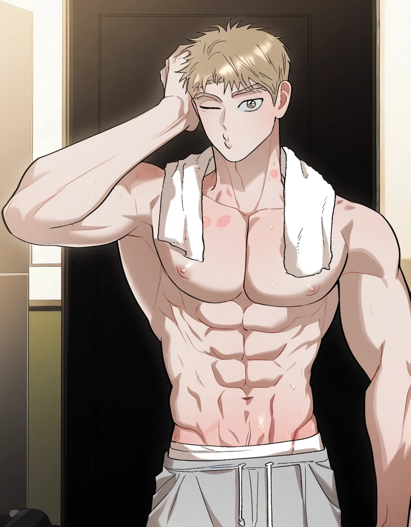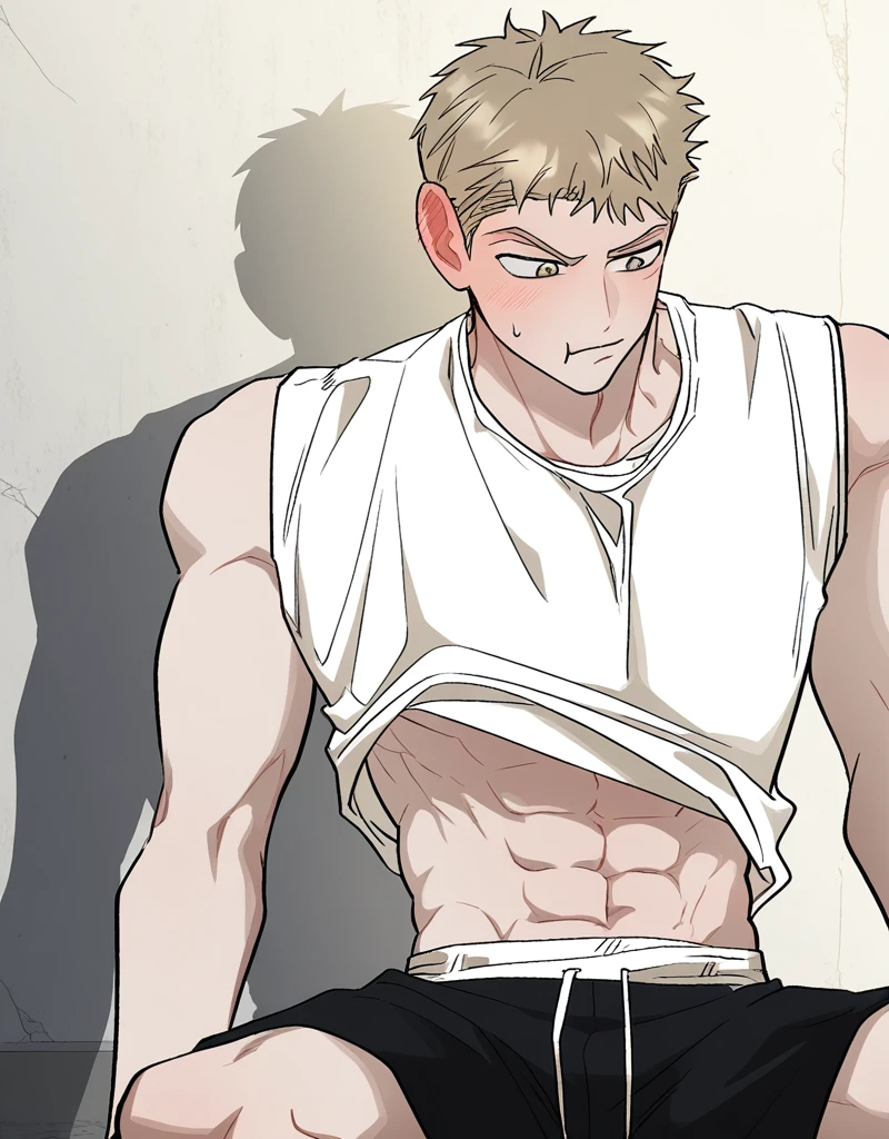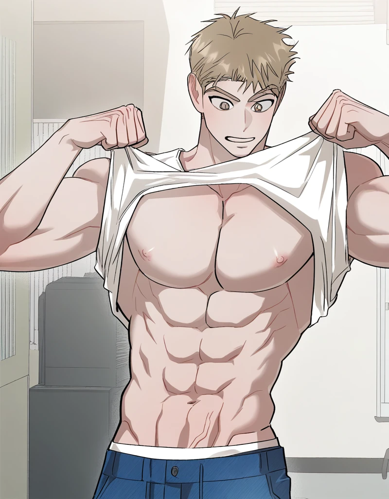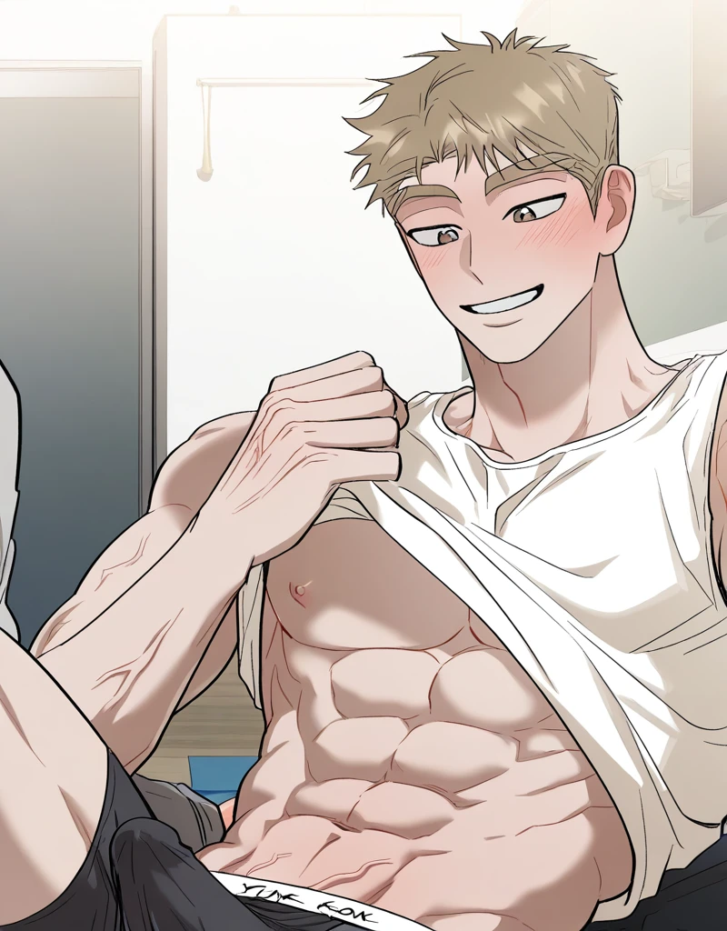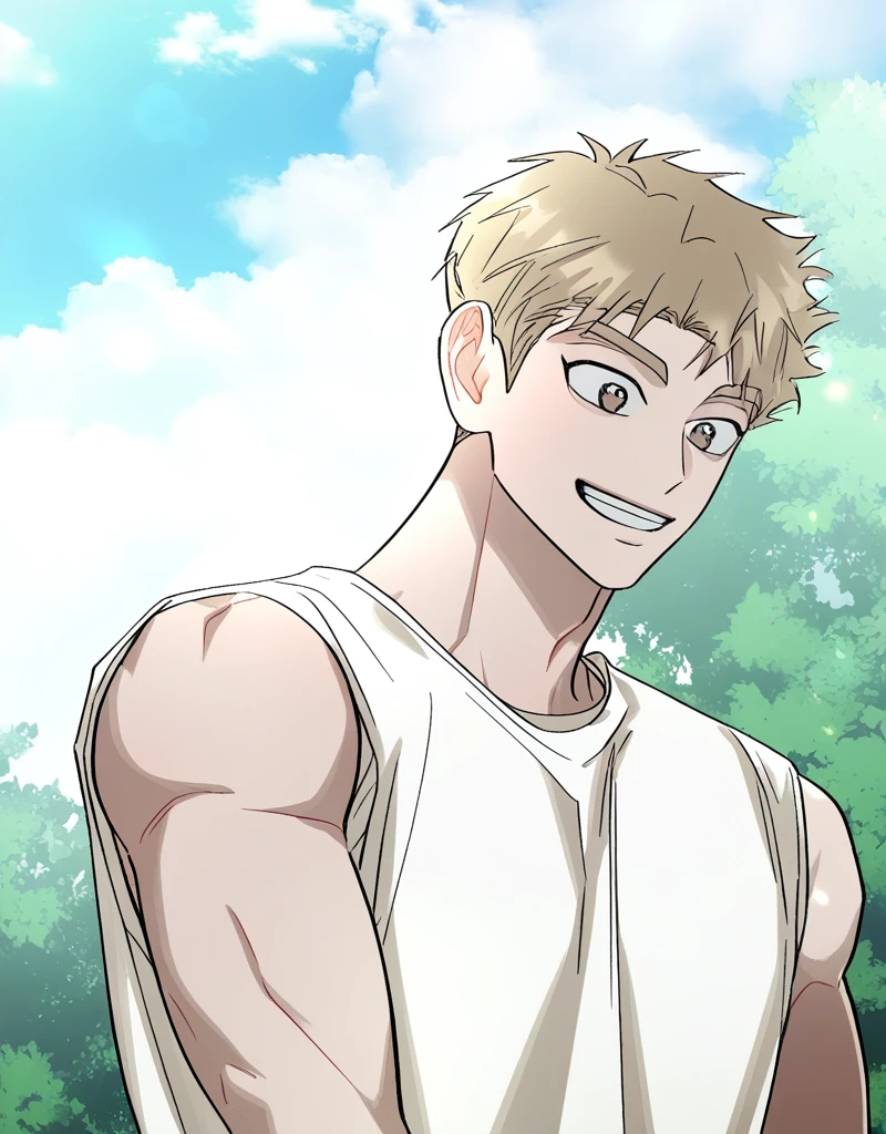 Tags: hong_kihoon, short hair, blonde hair, brown eyes, smile, open mouth, thick eyebrows, brown hair