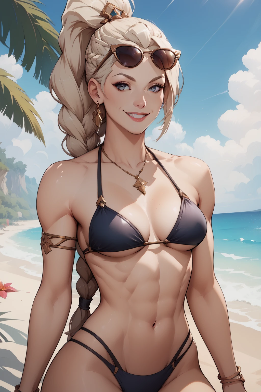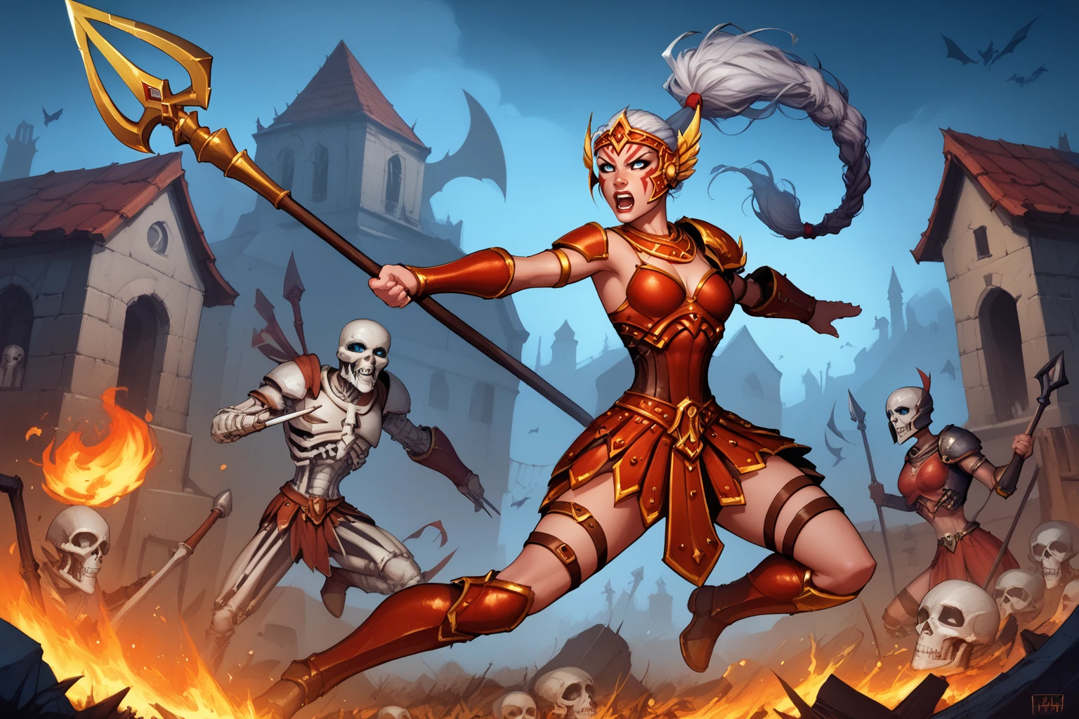 Trigger Cassia : Amazn, white long hair, ponytail, braid, helmet, face paint, collar, armored dress, Pauldrons, bracer, thigh strap, greaves, sandals, shield, trident, armlet