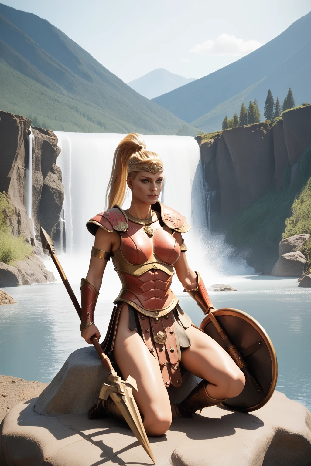 Trigger Amazon : Amazn, long hair, blonde hair, ponytail, circlet, Breastplate, pauldros, armlet, bracer, pelvic curtain, faulds, thigh strap, boots, shield, spear