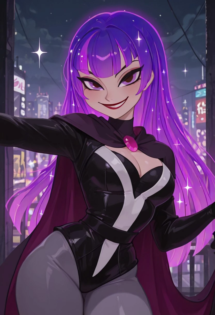 Hero outfit, glowing hair,sparkles on hair, black leotard,cleavage cutout,fuchsia jewel on , dark magenta cape, gray leggings, thigh high boots