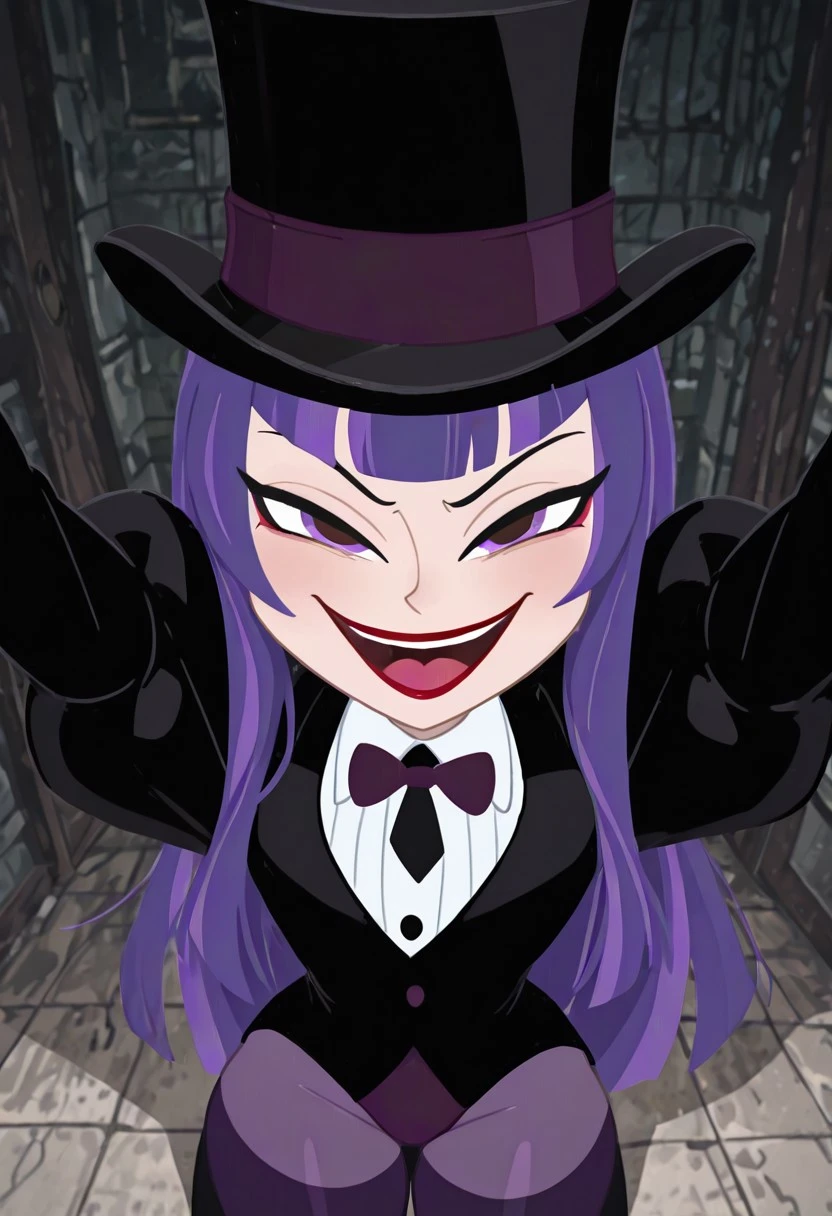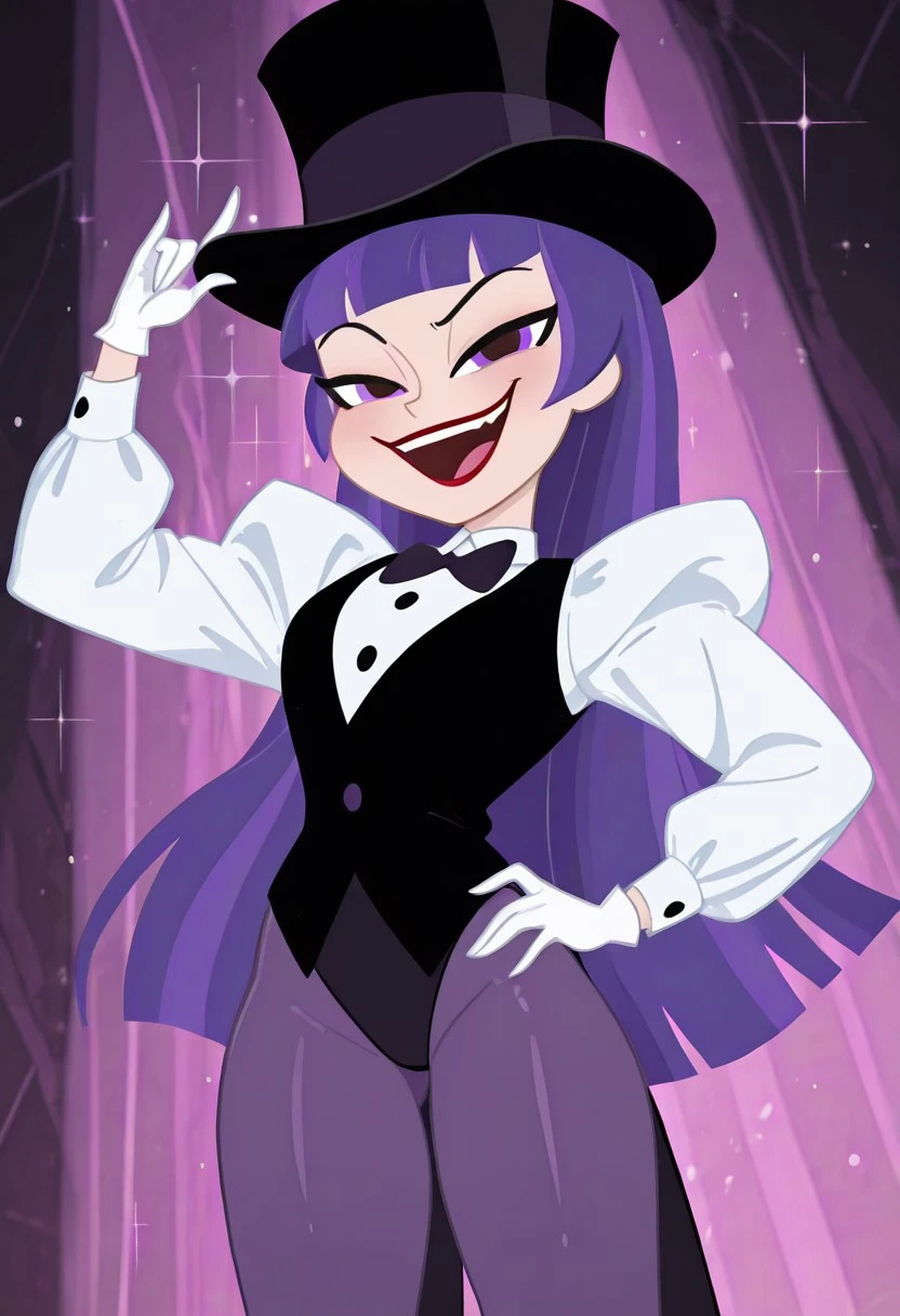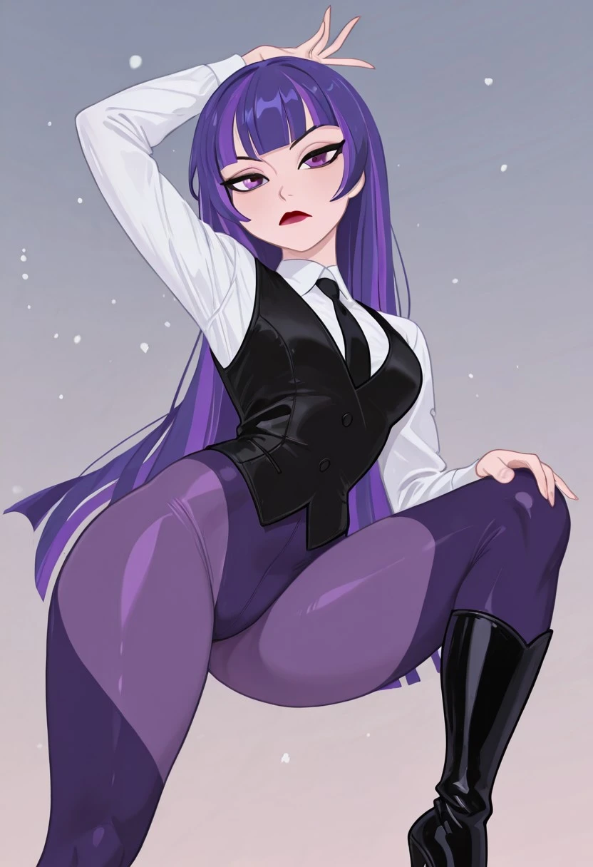 Performance outfit, white collared shirt, long sleeves, baggy sleeves, black vest, black necktie, multicolored purple tight leggings, heeled boots