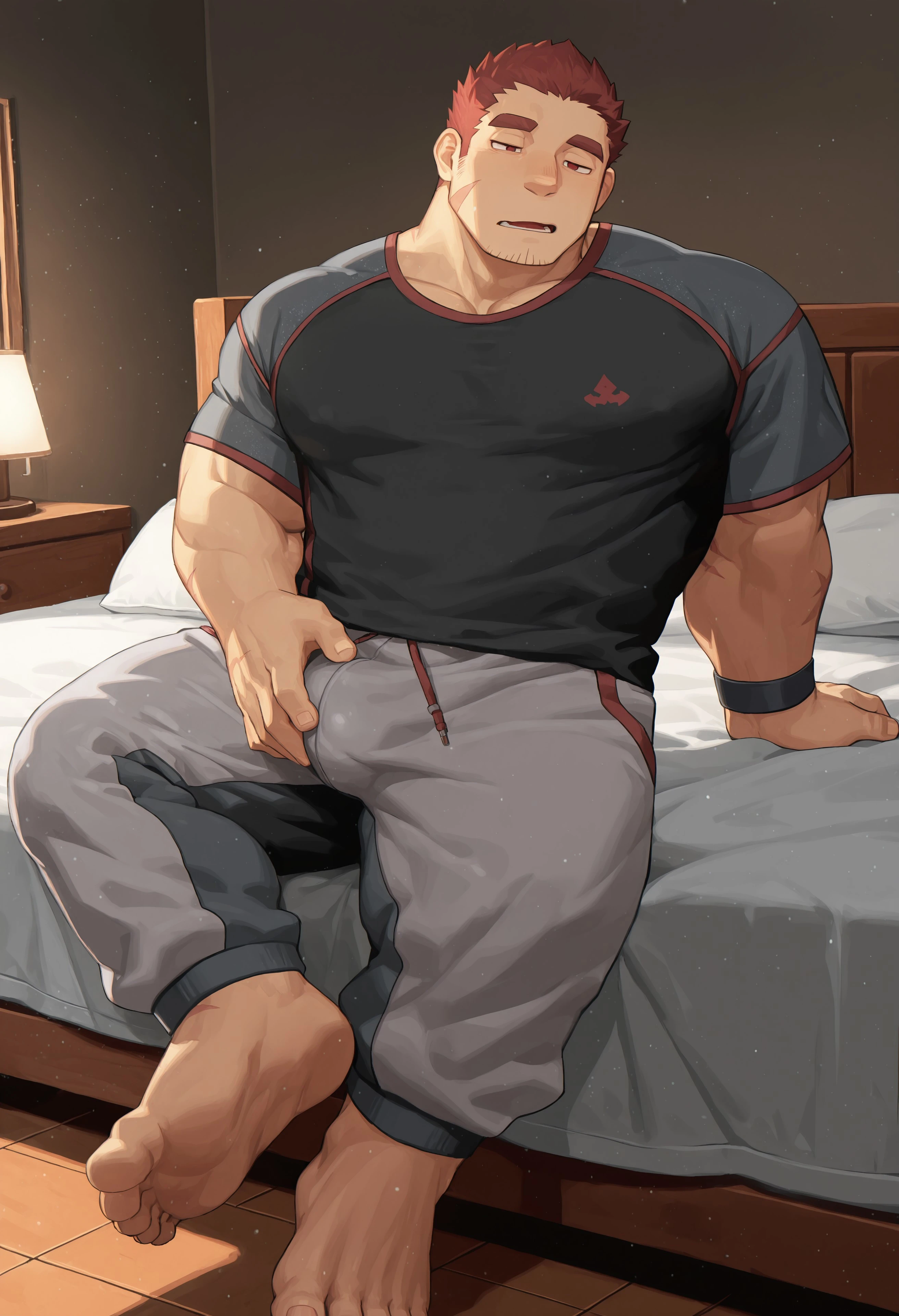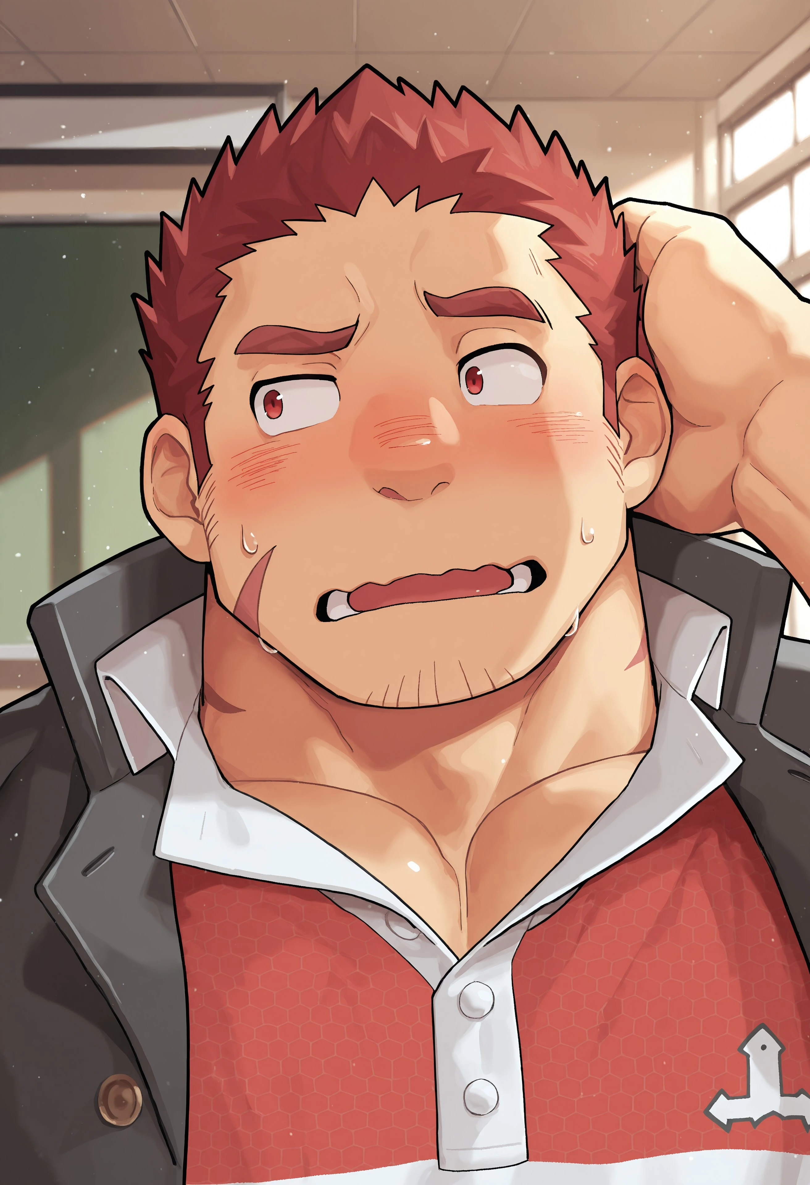 muscular male, red hair, short hair, red eyes, facial hair, stubble, scar on cheek, scars all over
