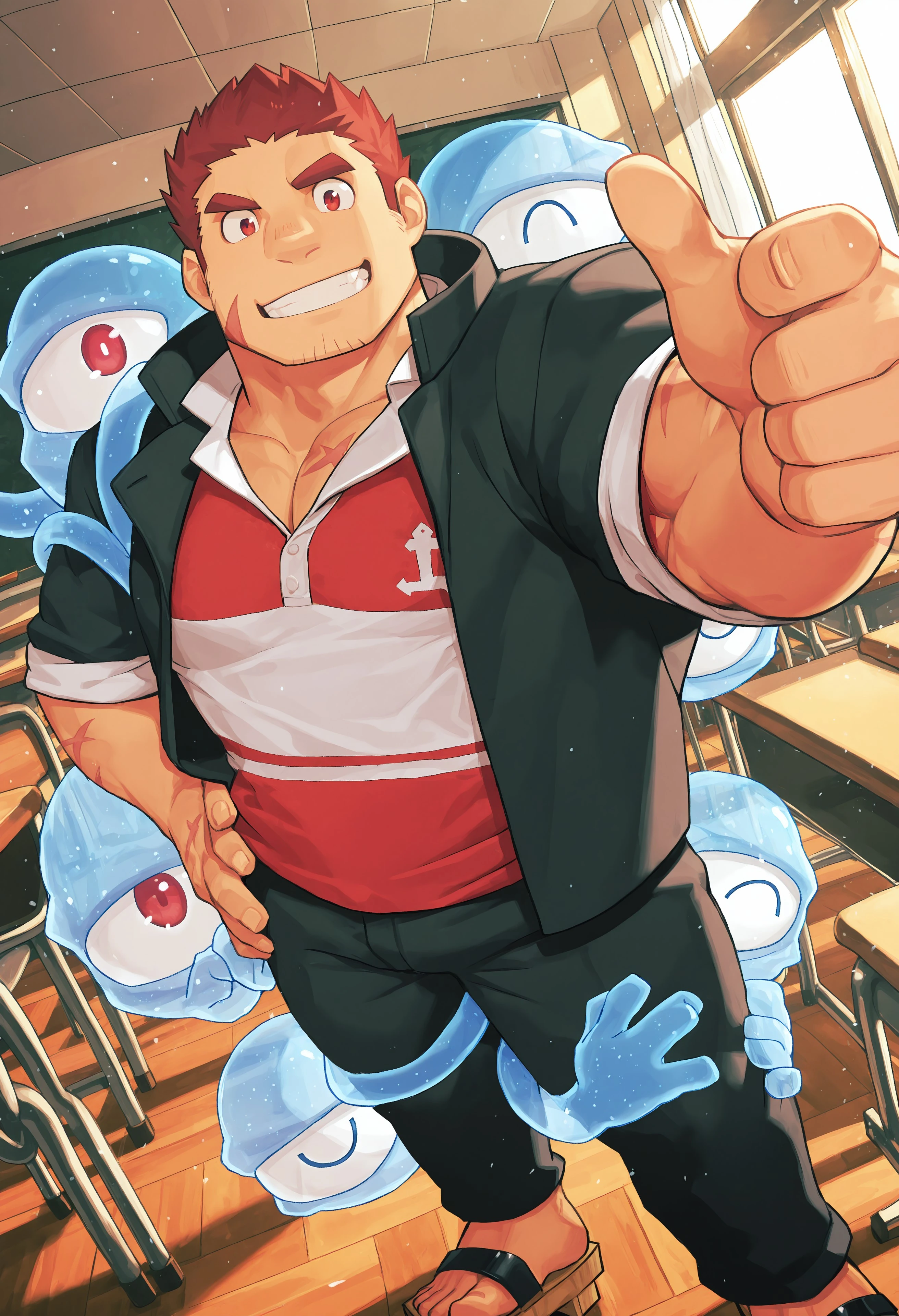 school uniform, black jacket, open jacket, sleeves rolled up, red jersey, black pants, (sandals, geta)For Rugby Uniform: