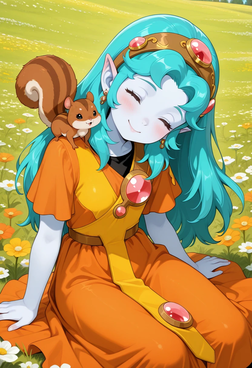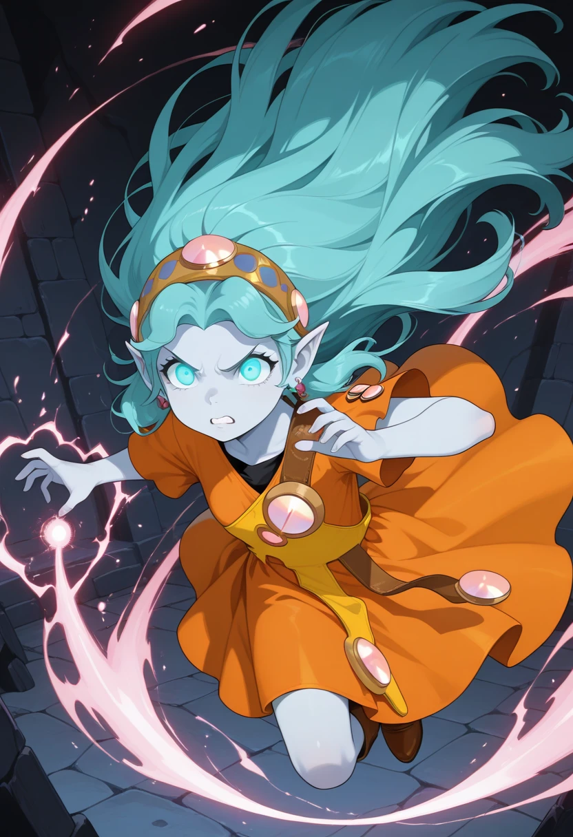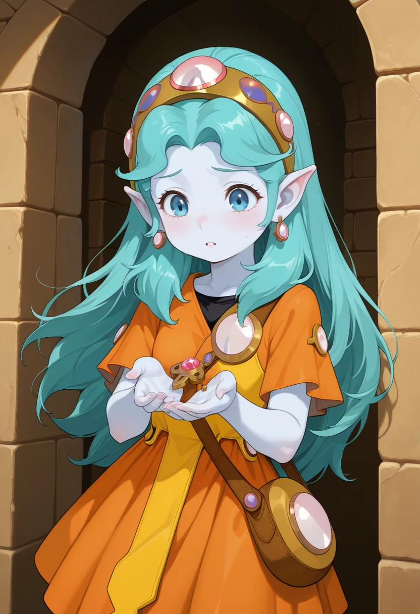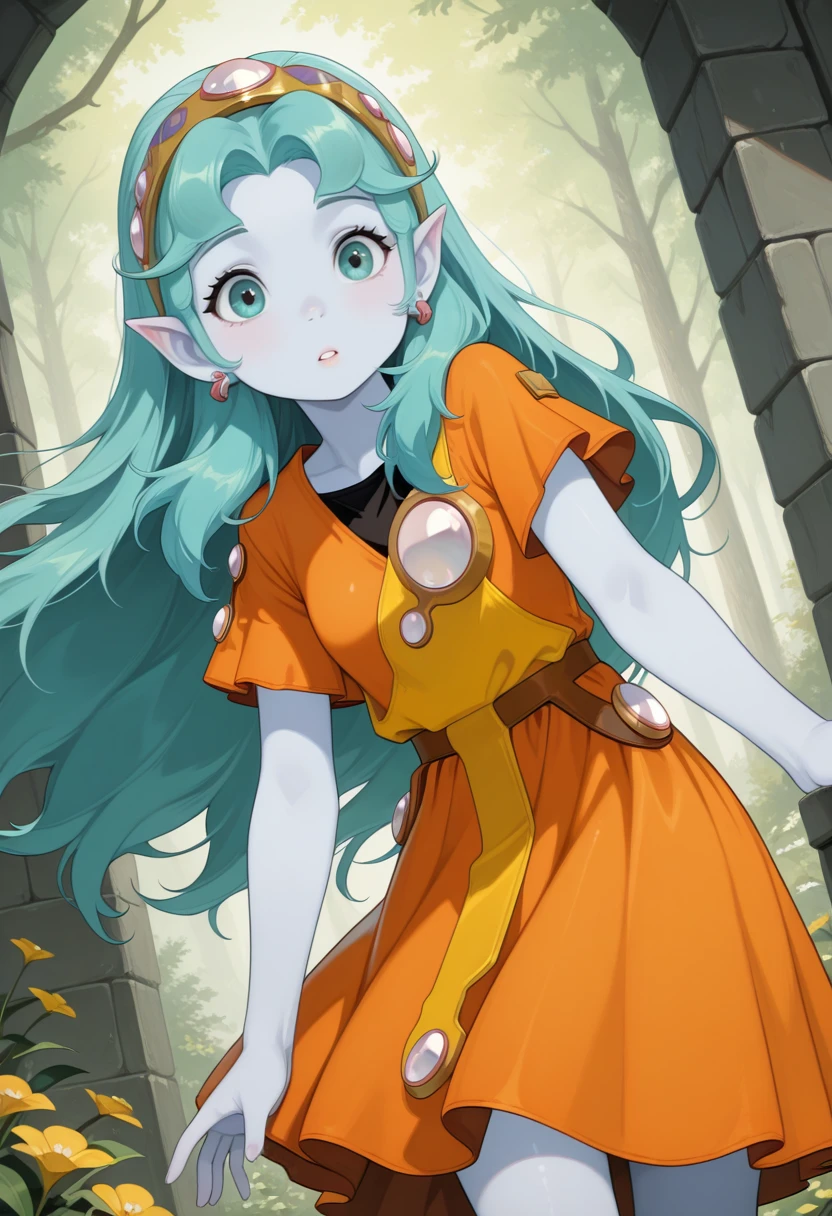 Trigger : yena, aqua hair, long hair, pale blue skin, aqua eyes, pointy ears, tiara, earrings, black shirt, layerd dress, orange dress, yellow dress, jewelry