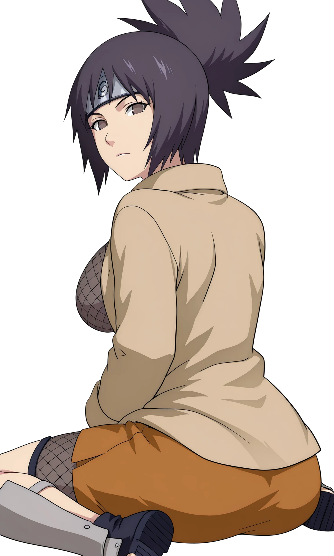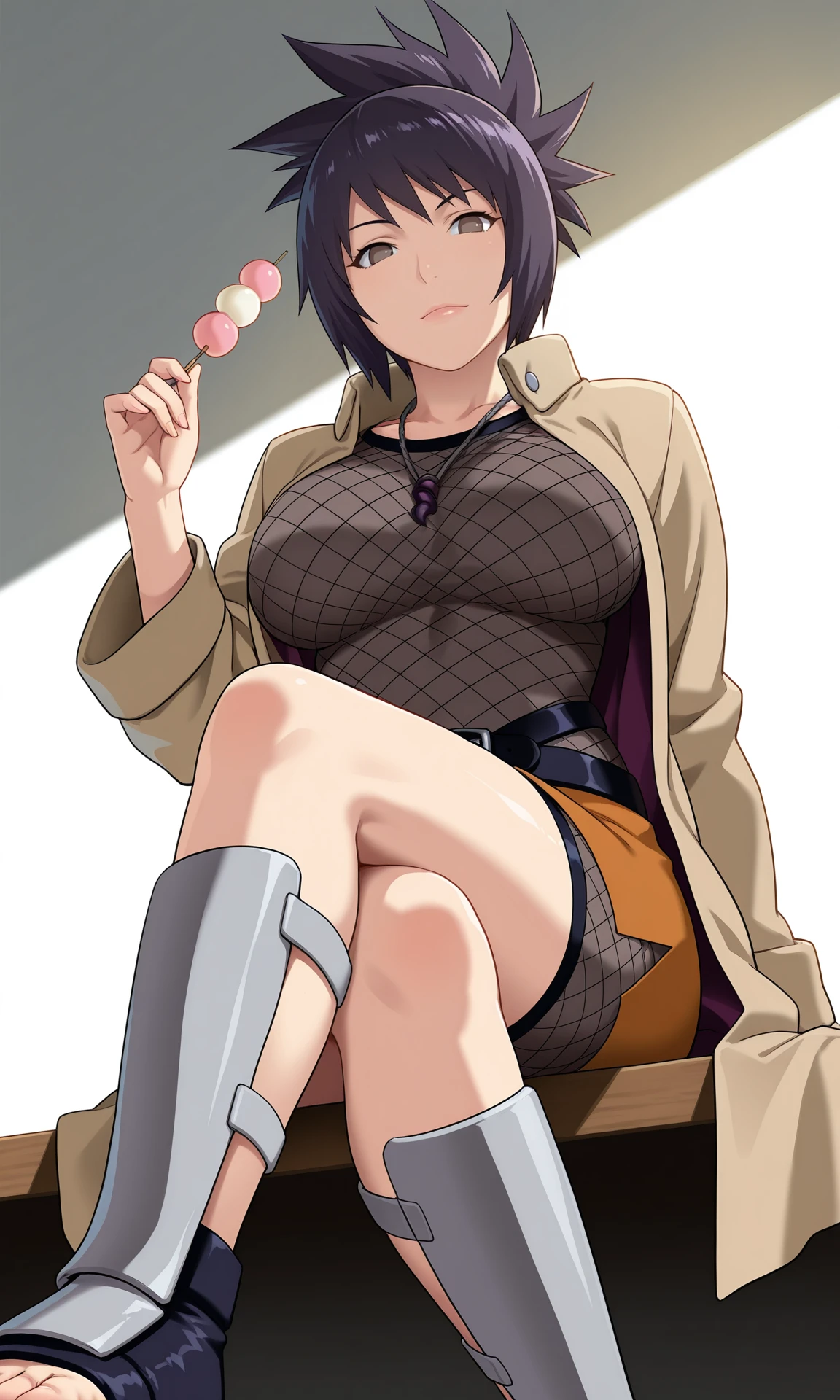 ankomitarashire, brown eyes, ponytail, forehead protector, konohagakure symbol, fishnet bodysuit, necklace, brown coat, belt, orange skirt, shin guards, toeless footwear