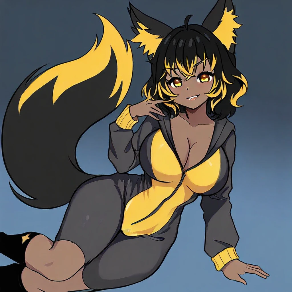 1girl, solo, kitsune, fox girl, fox ears, tail, dark skinned, black hair, multicolored hair, yellow eyes, black and yellow bodysuit, zipper, cleavage, black socks, large breasts, slim waist, hips