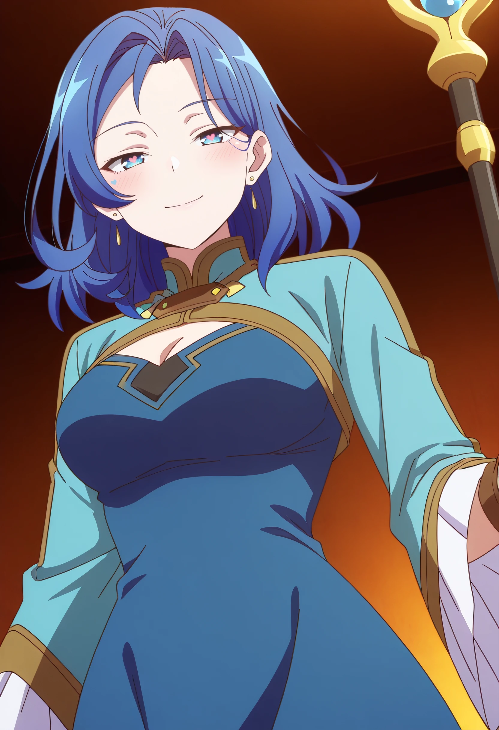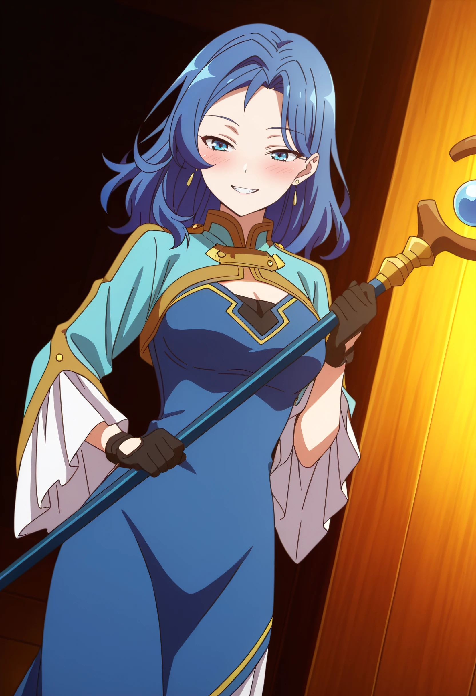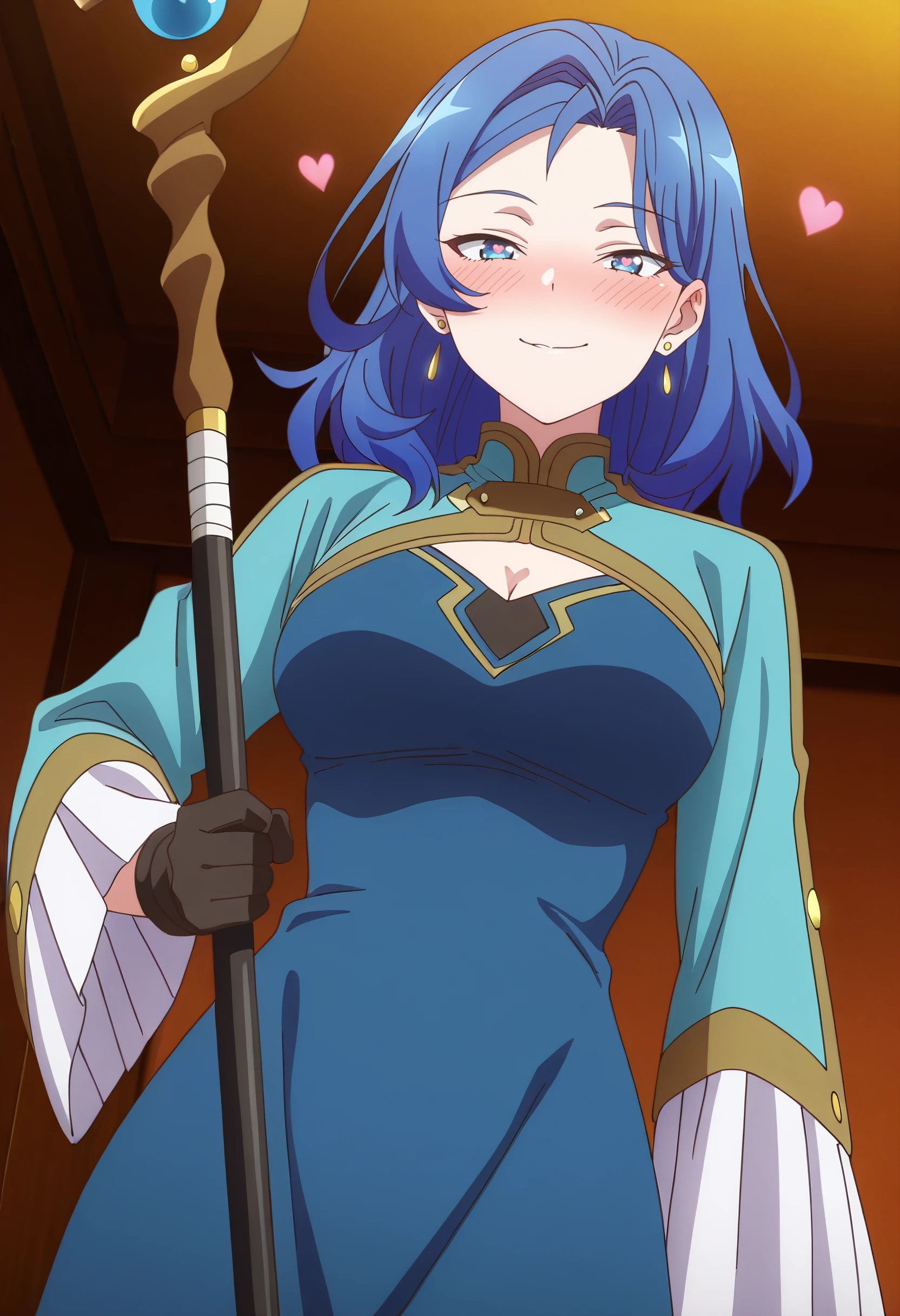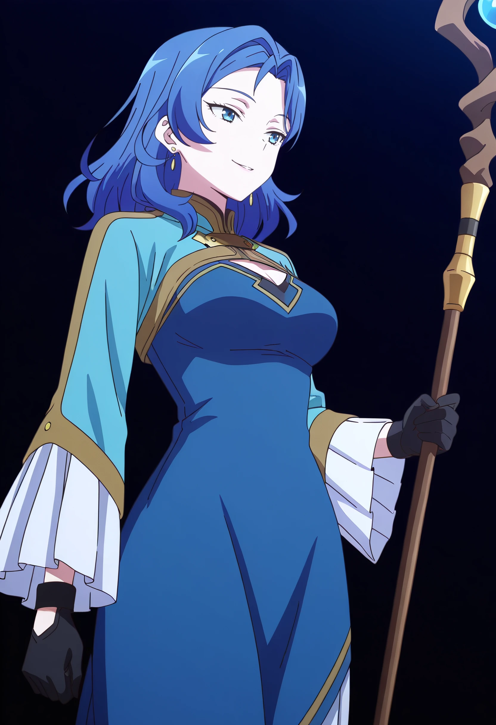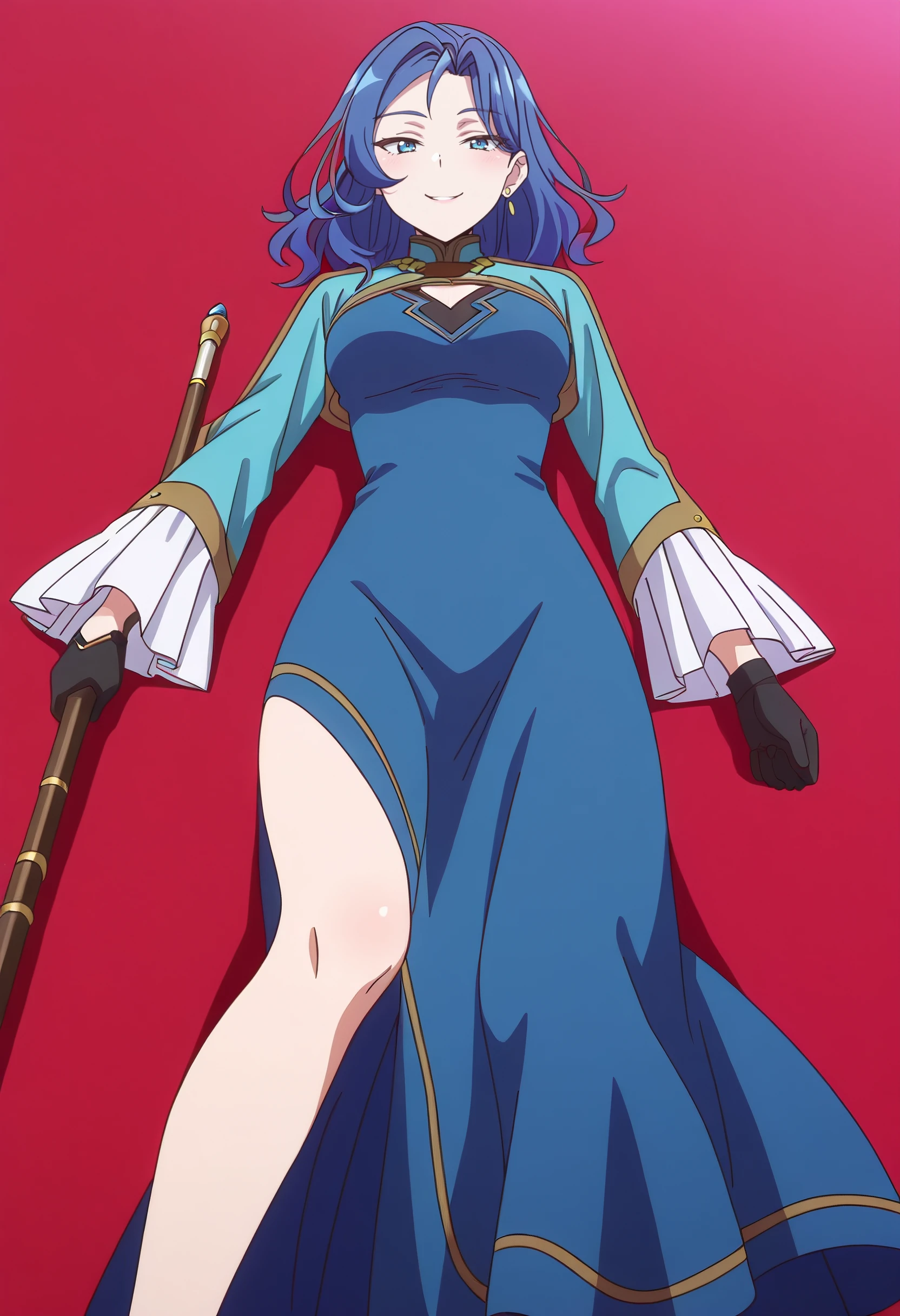 FilminaOutfit, earrings, jewelry, blue dress, dress, long sleeves, gloves, clothing cutout, cleavage cutout, shrug (clothing), capelet, black gloves, wide sleeves, long dress,