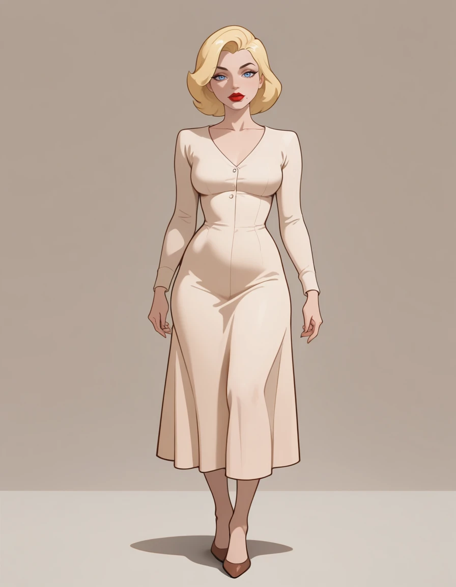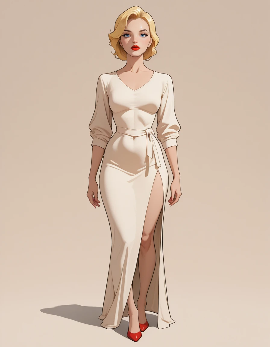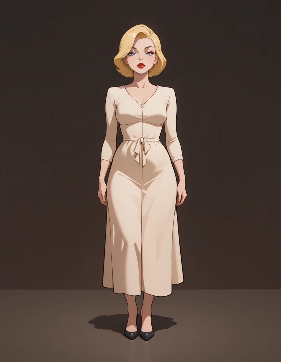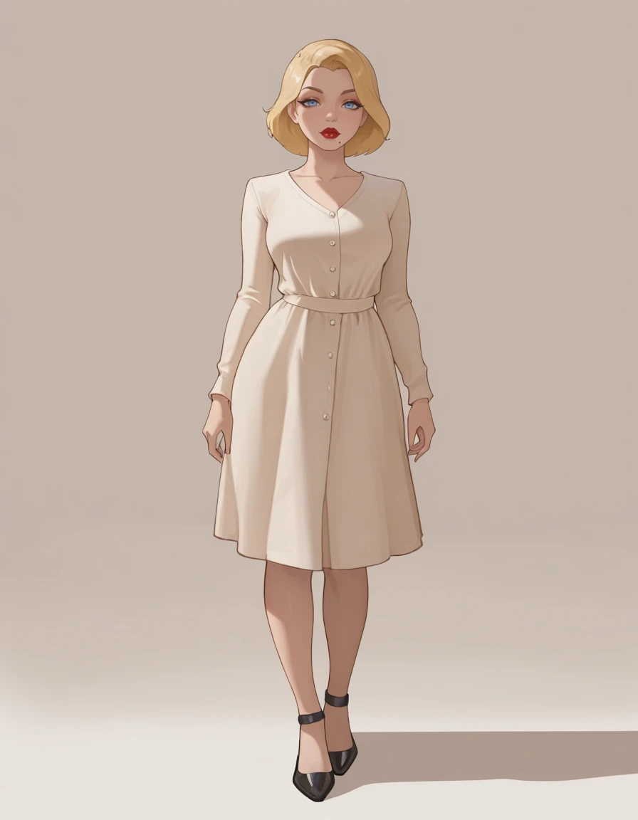 RandaDuaneILBAS, 1girl, blonde hair, blue eyes, red lips, mole under mouth, beige dress