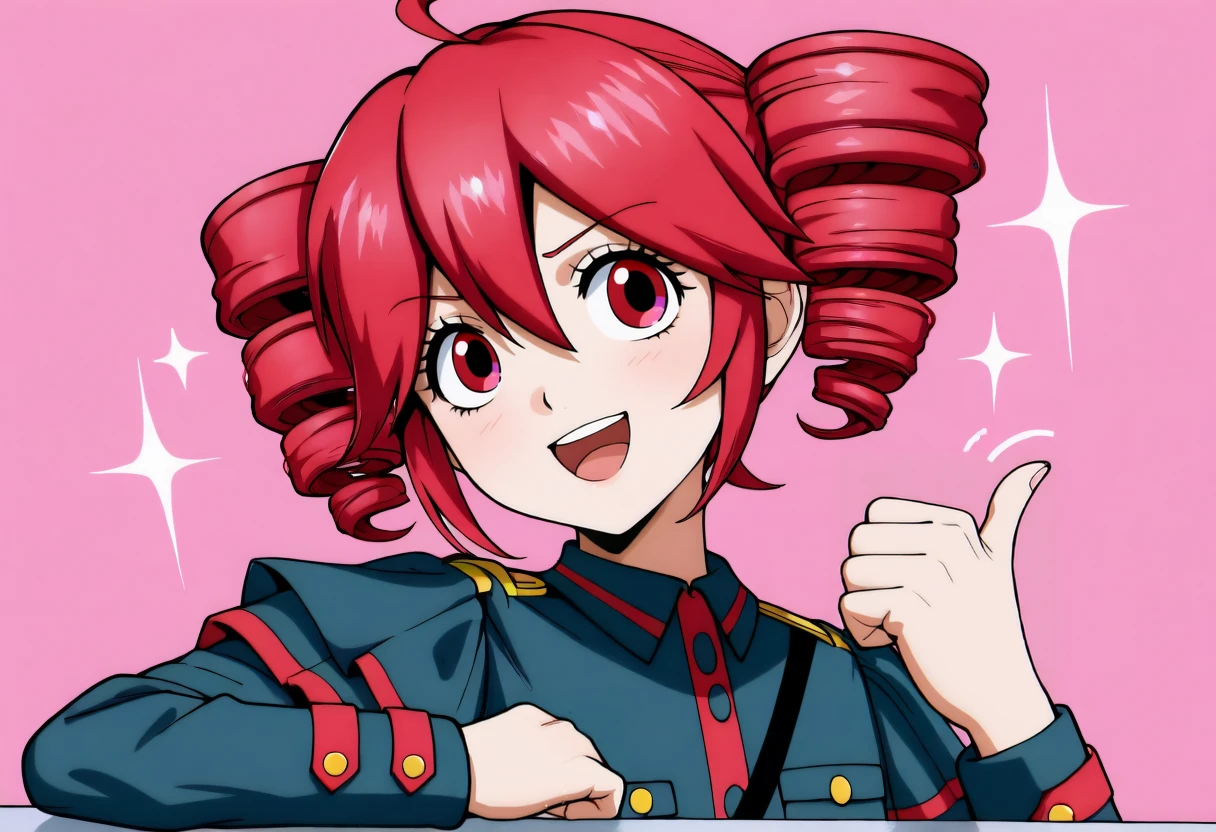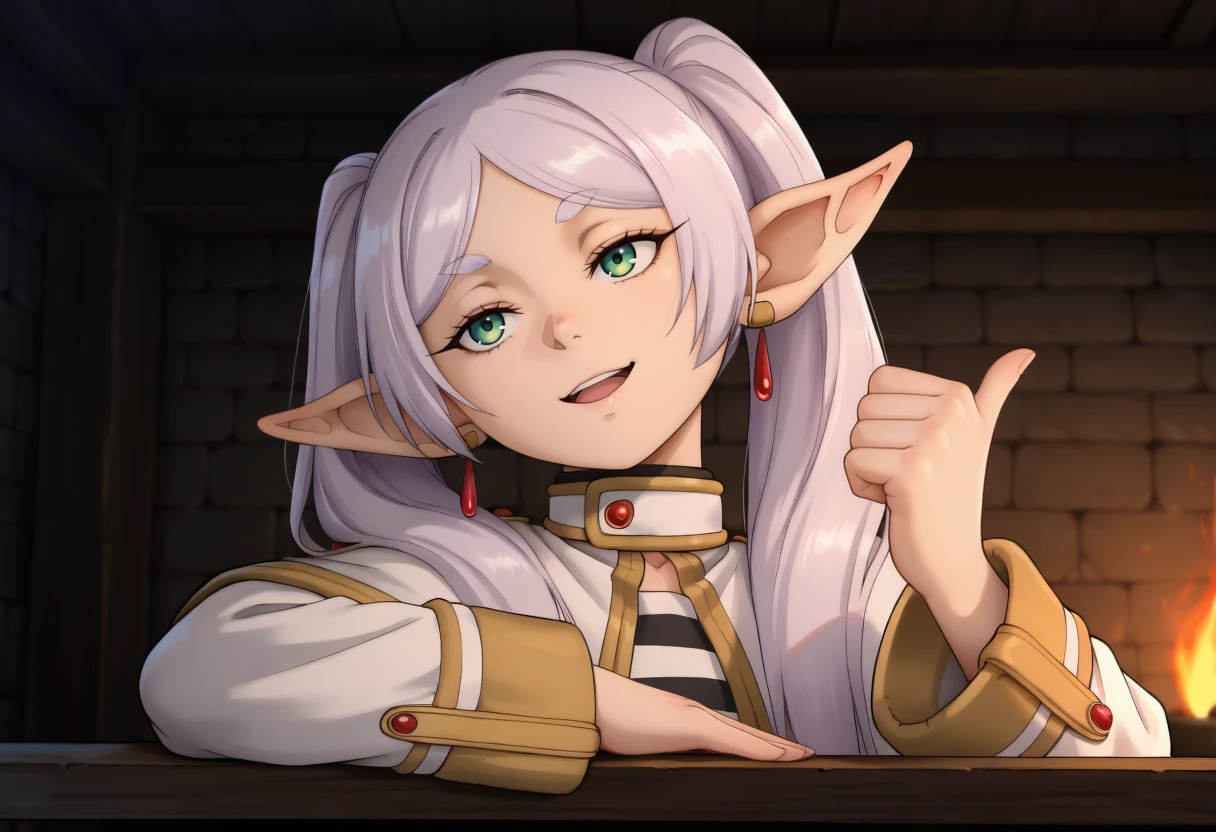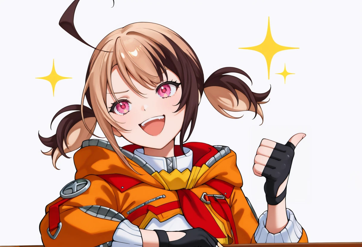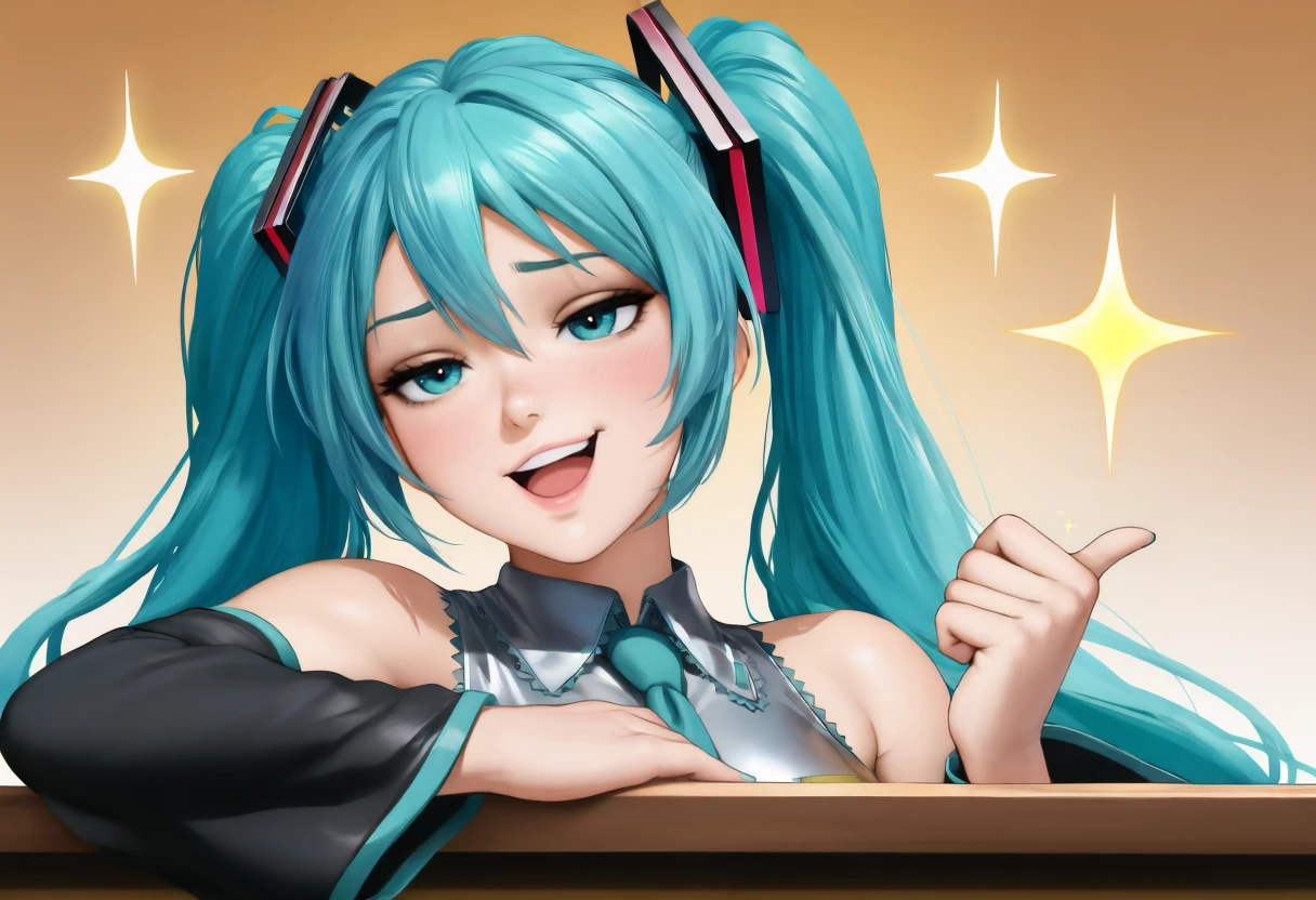 Trigger word: hand on table, pointing with thumb, sparkle,