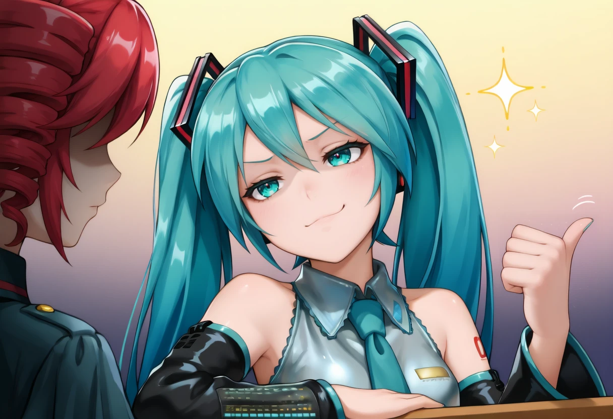 hand on table, pointing with thumb, sparkle,