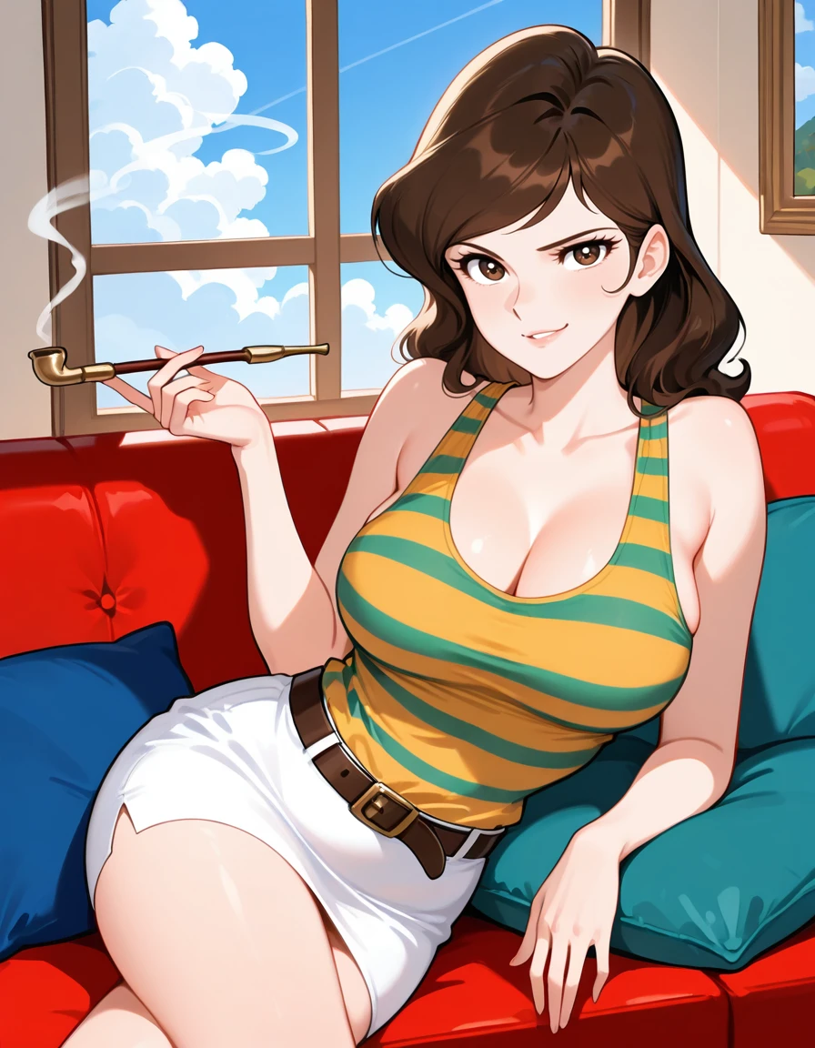 (fujiko_striped_tank_top, yellow and green striped tank top, cleavage, belt, white pencil skirt), (blue heel sandals), (holding smoking pipe)
