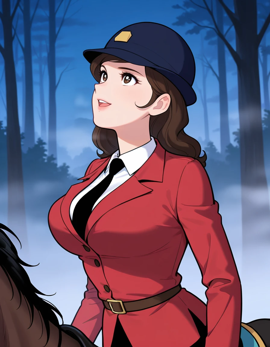 (fujiko_blue_cap, dark blue cap:1.5), (equestrian outfit, pant suit, red jacket, black necktie, white shirt, black pants, dark brown knee boots), (horseback riding:1.4)