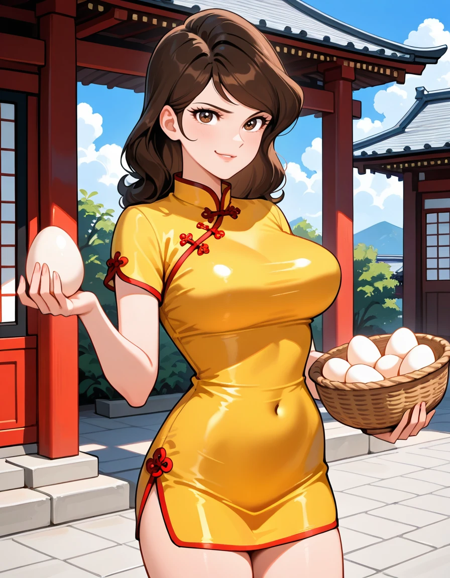 (yellow china dress, short sleeves, microdress, red trim, red flats), (holding small basket with eggs)