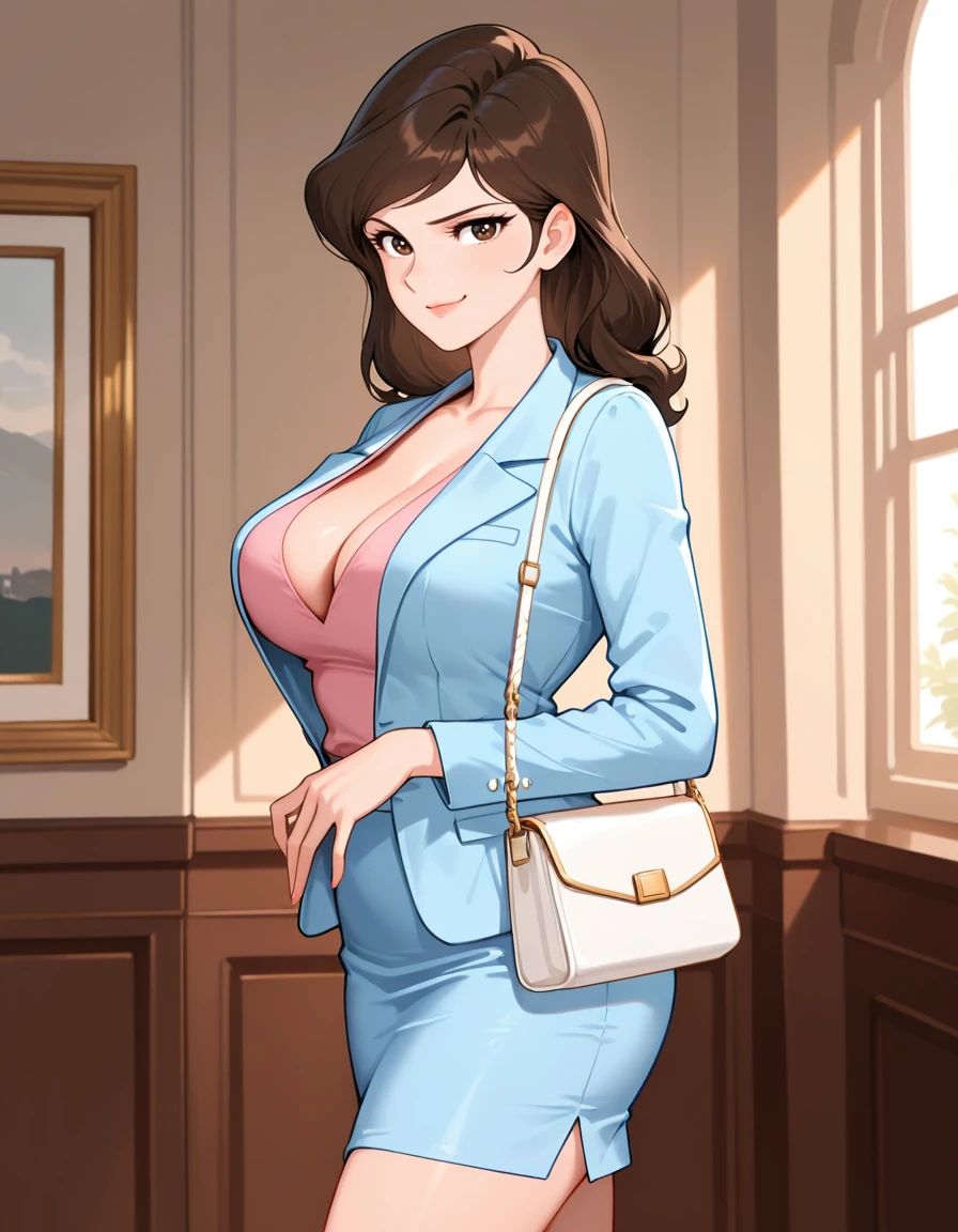 (mine_fujiko_pt2), (fujiko_sharp_eyes, brown eyes, brown hair, swept bangs, large breasts)