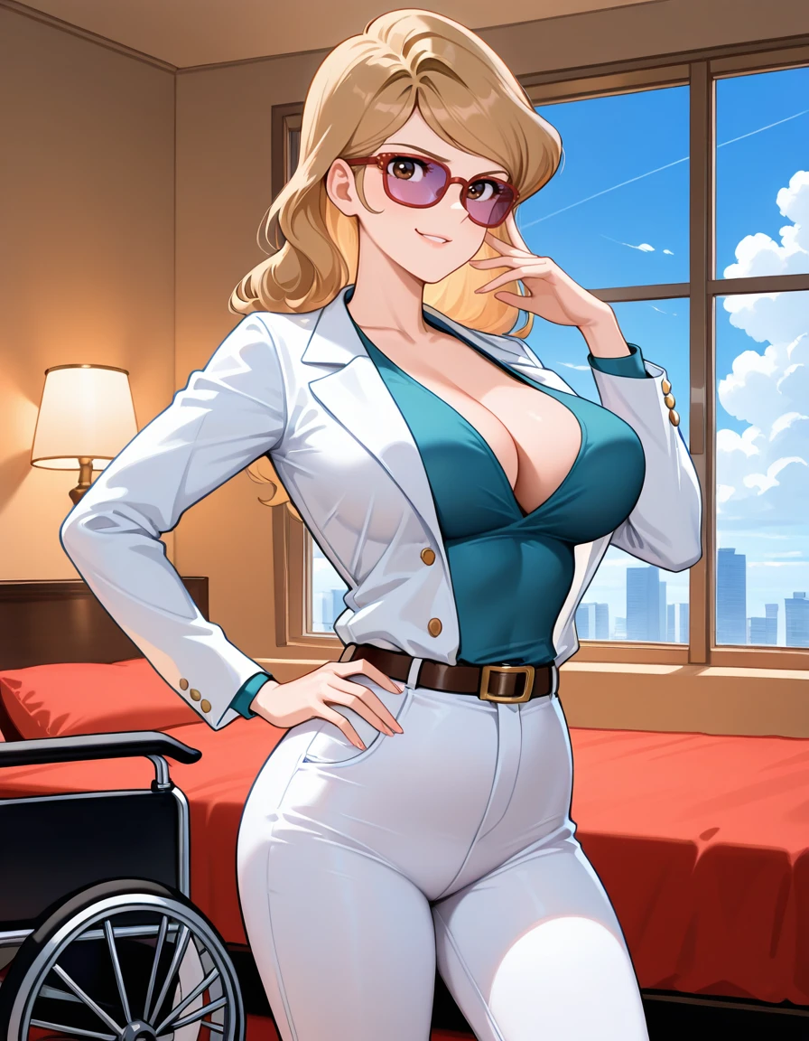 (blonde hair:1.3), (purple-tinted eyewear, red-framed eyewear), (formal clothes, skin jacket, open front, long sleeves, muted petrol blue v-neck, white pants, flare pants), (red sandals)