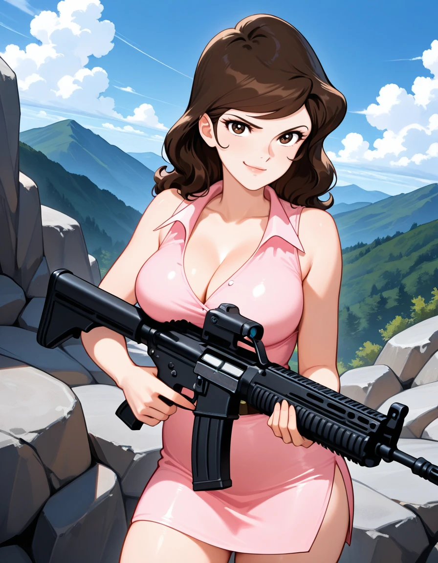 (pink sleeveless dress, cleavage, short dress, side slit, skin tight), (holding, assault rifle)