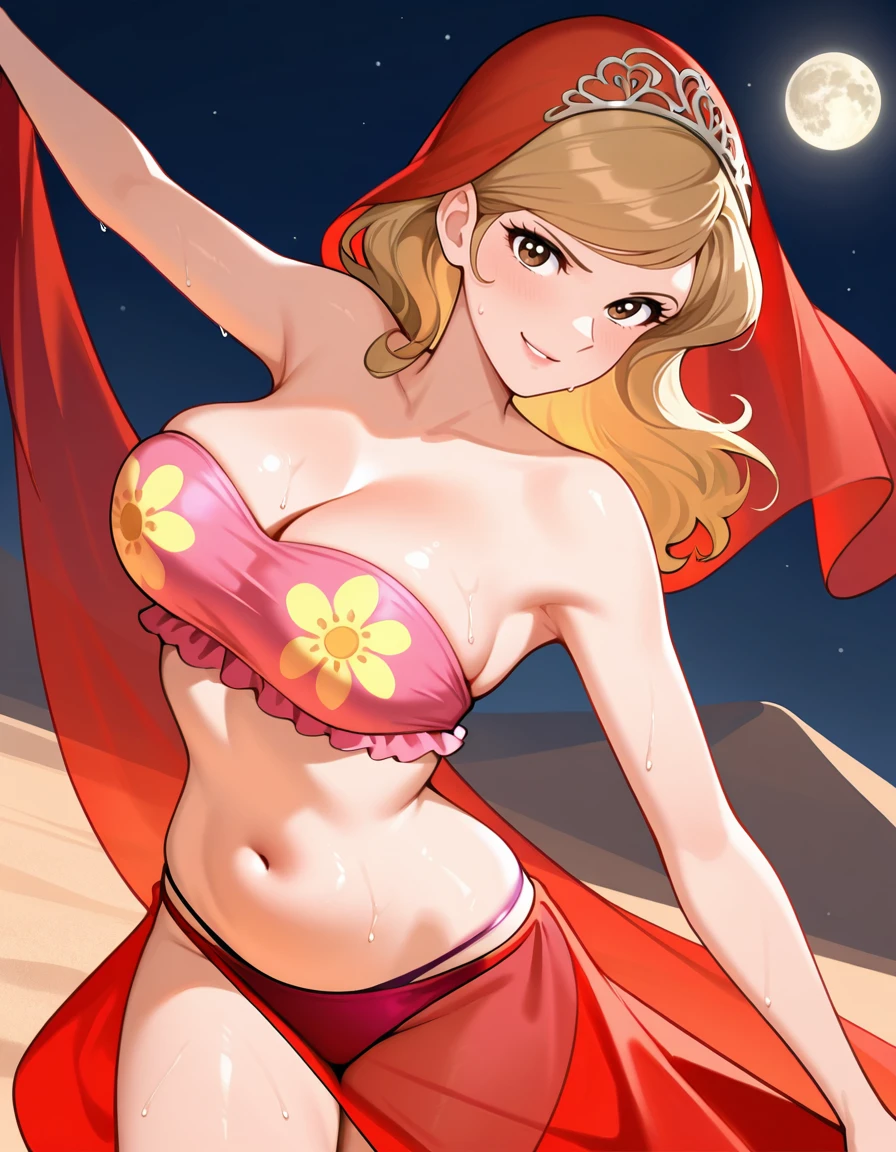 (blonde hair:1.3), (belly dancer, fujiko_long_veil, red long veil, see-through veil, cleavage, fujiko_floral_bikini, pink bandeau bikini, floral print bandeau, floral print bikini bottom, red high heels)