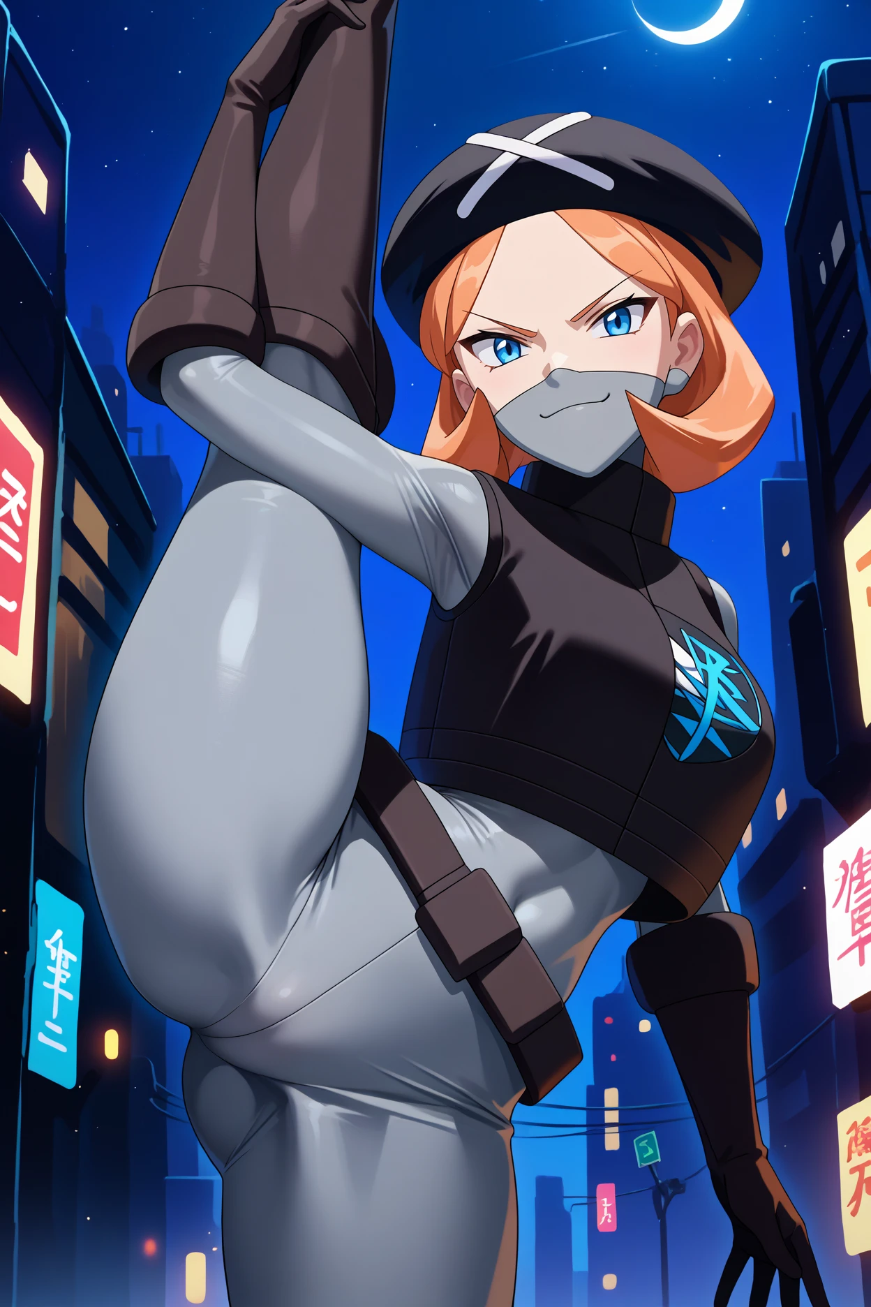 black beret, mouth mask, black vest, grey bodysuit, belt, black gloves, black boots