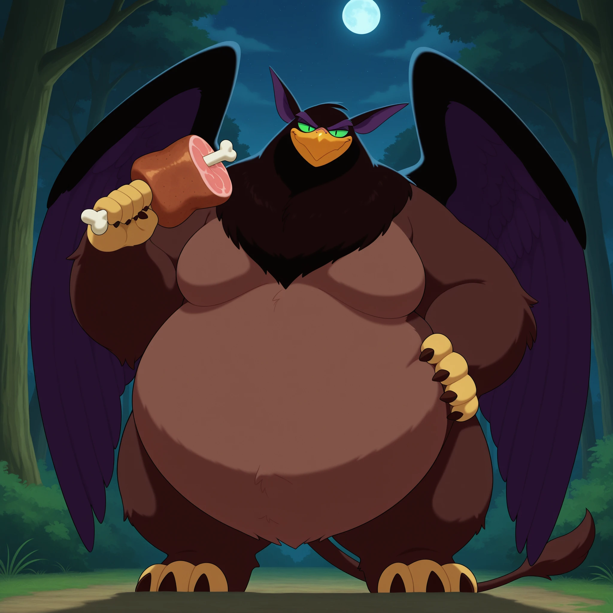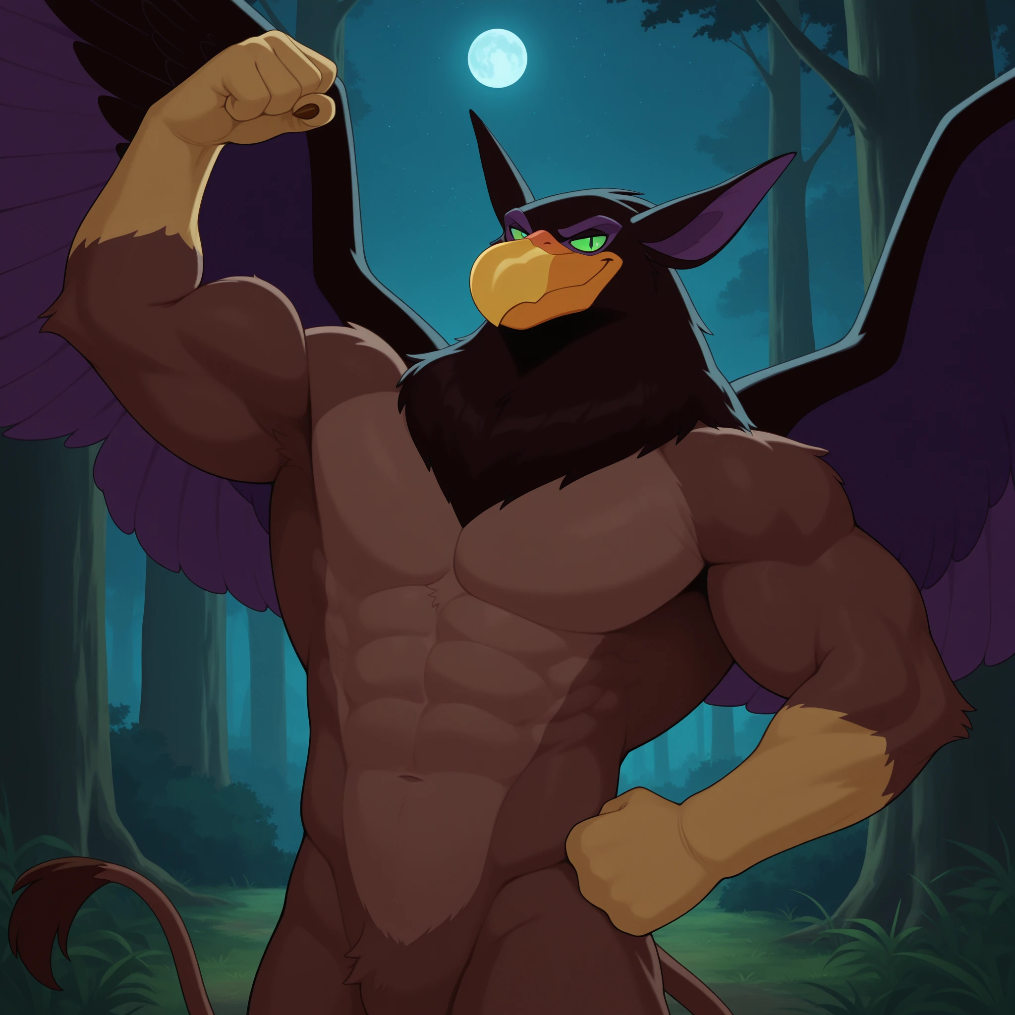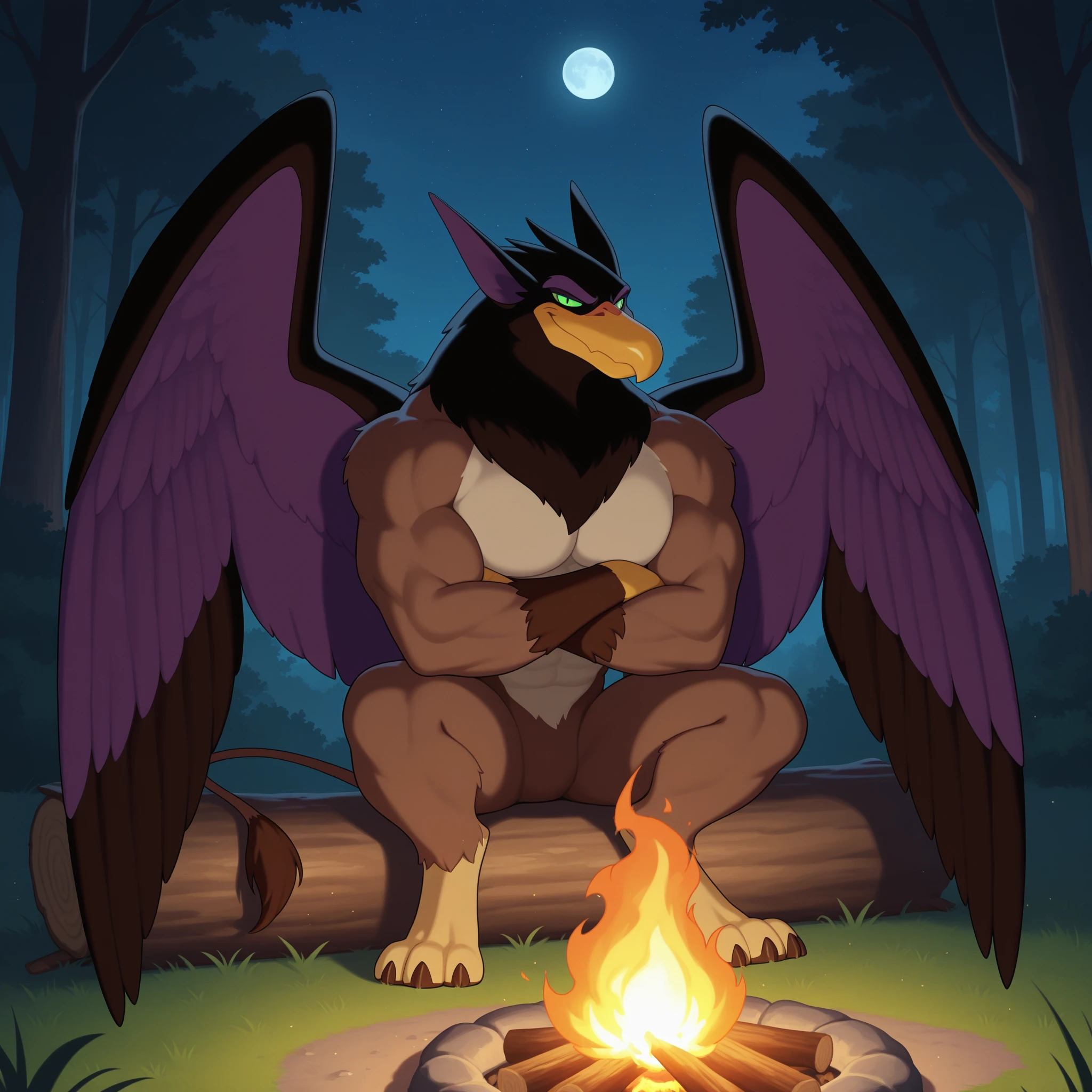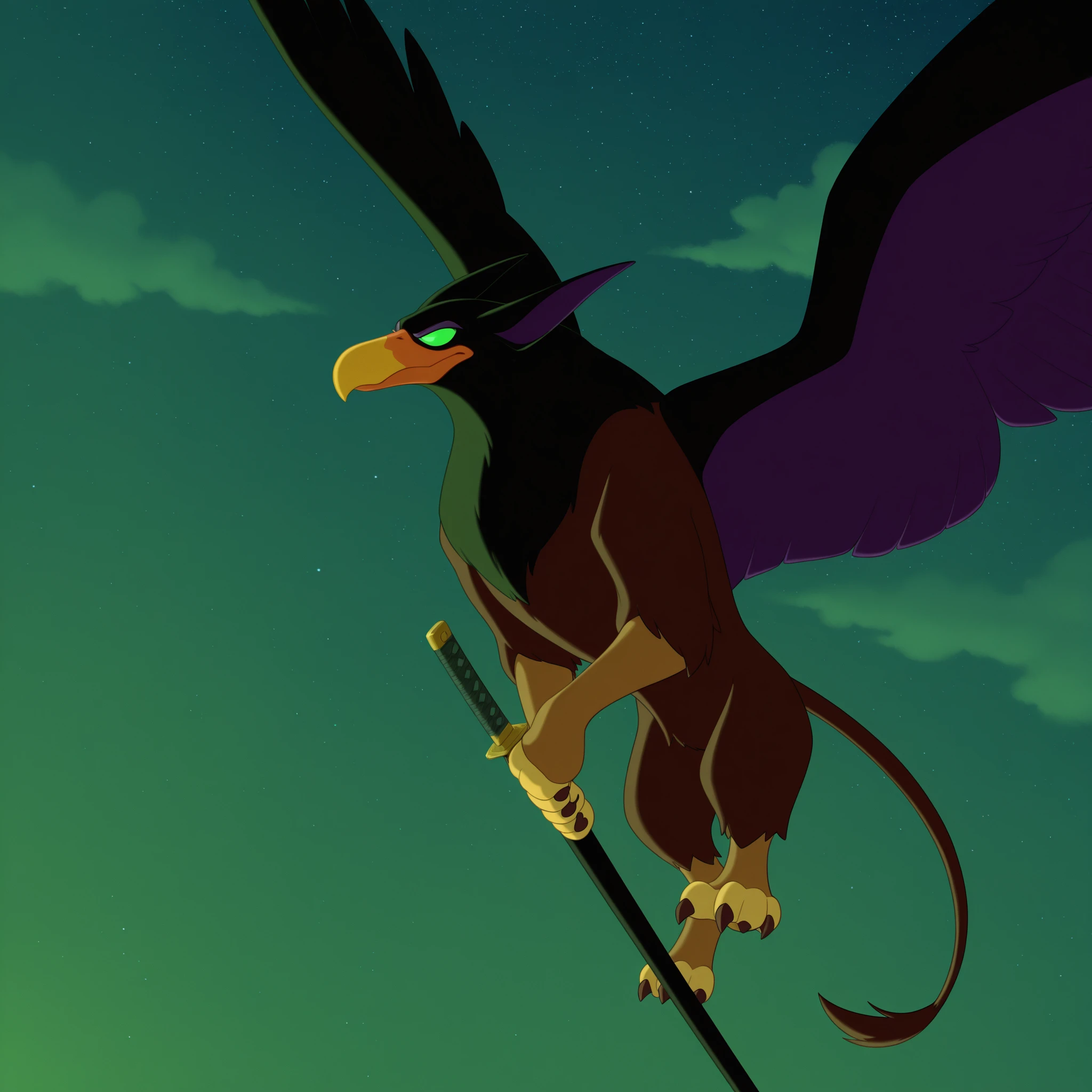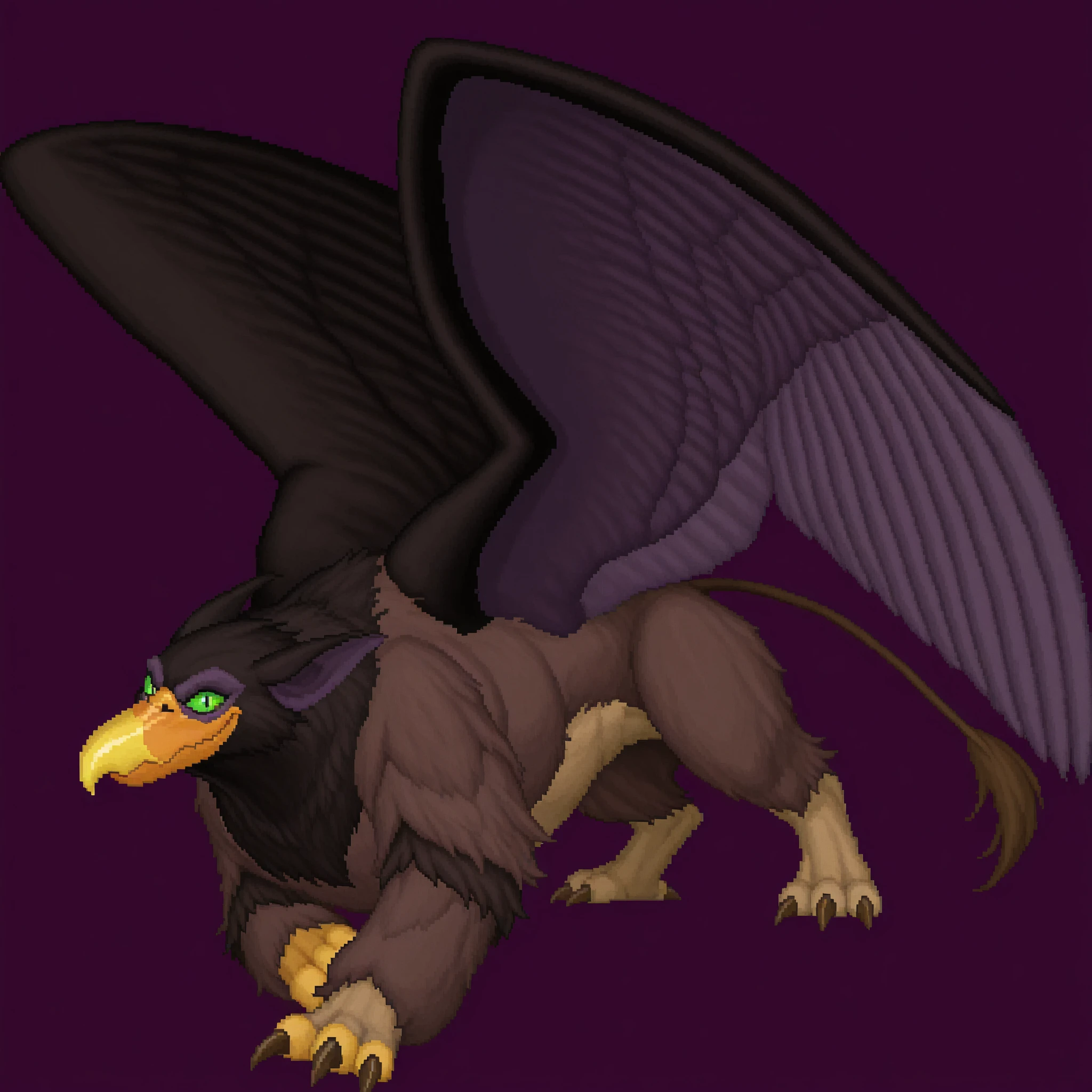 qfcgr, griffin, two-tone fur, brown fur, two-tone feathers, brown feathers, black feathers, pointy ears, green sclera, slit pupils, two-tone wings, black wings, purple wings, brown claws, lion tail