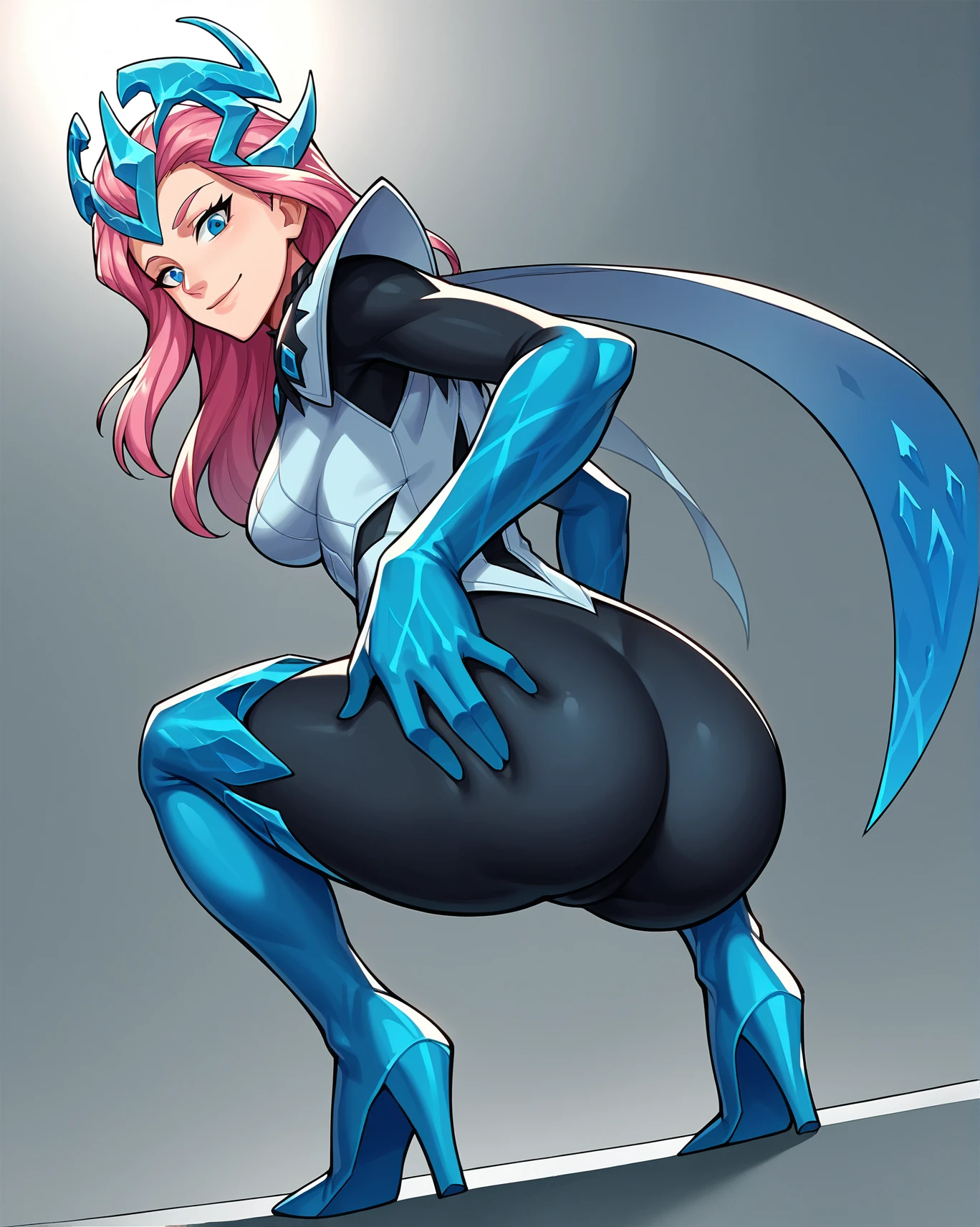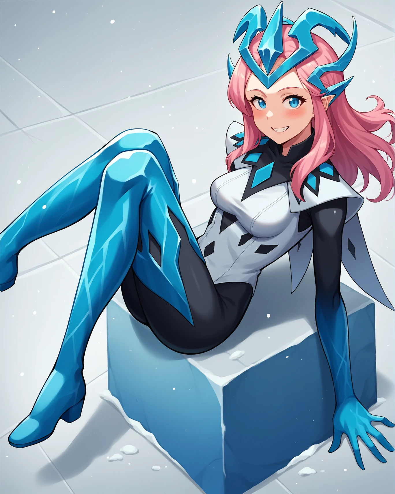 Activation tags are "AlysiaBR, pink hair,blue eyes, headgear, ice crown" for the appearance and "ice gloves, black bodysuit, headgear, elbow gloves, ice crown, cape, floating cape, shoulder pads, high collar, white vest, thigh boots, ice boots" for the main outfit.