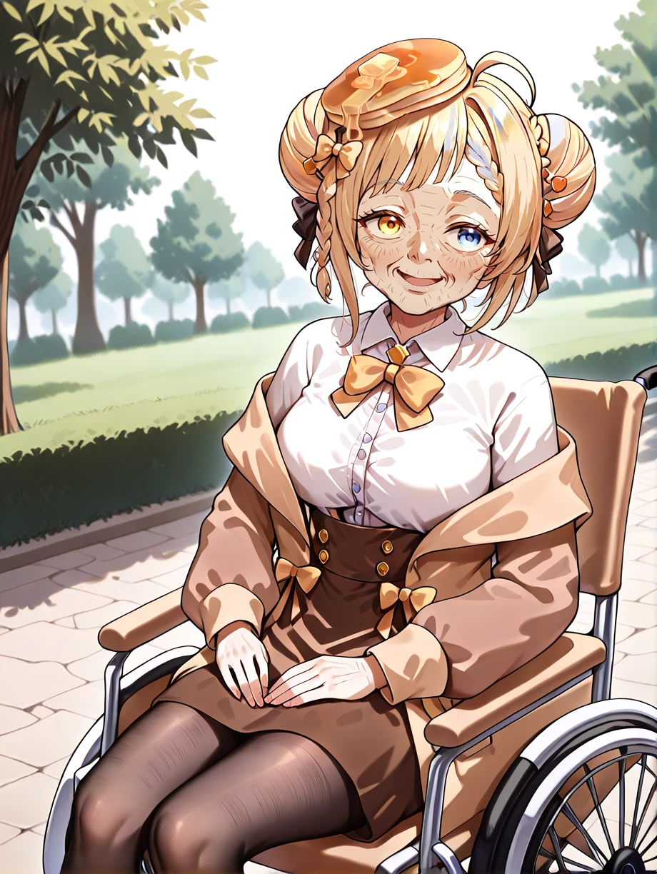 1girl,solo,LocoLost, hair bun, heterochromia, bow, blonde hair, double bun, blue eyes, braid, shirt, white shirt, virtual youtuber, multicolored hair, pancake,pancake on head, long sleeves, jacket, yellow eyes, collared shirt, streaked hair, hair ornament, braided bangs, black bow, dress shirt, bowtie, blue hair, ahoge, off shoulder, hair bow, brown jacket, yellow bow, brown skirt, brown footwear,black skirt, pantyhose,plaid,