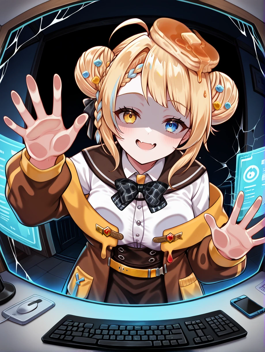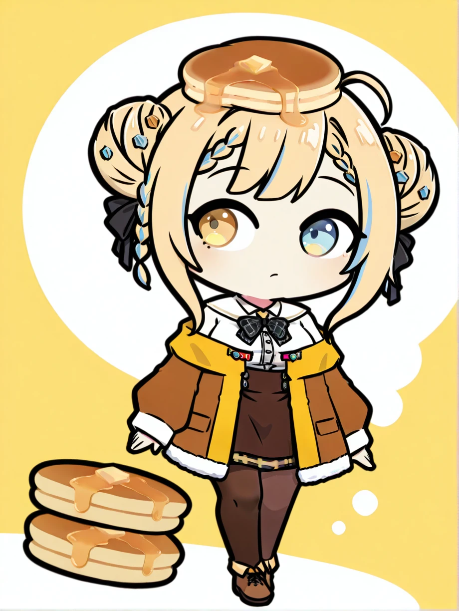 1girl,solo,LocoLost, hair bun, heterochromia, bow, blonde hair, double bun, blue eyes, braid, virtual youtuber, multicolored hair, pancake,pancakeon head, yellow eyes, streaked hair, hair ornament, braided bangs, blue hair, ahoge,hair bow, yellow bow,