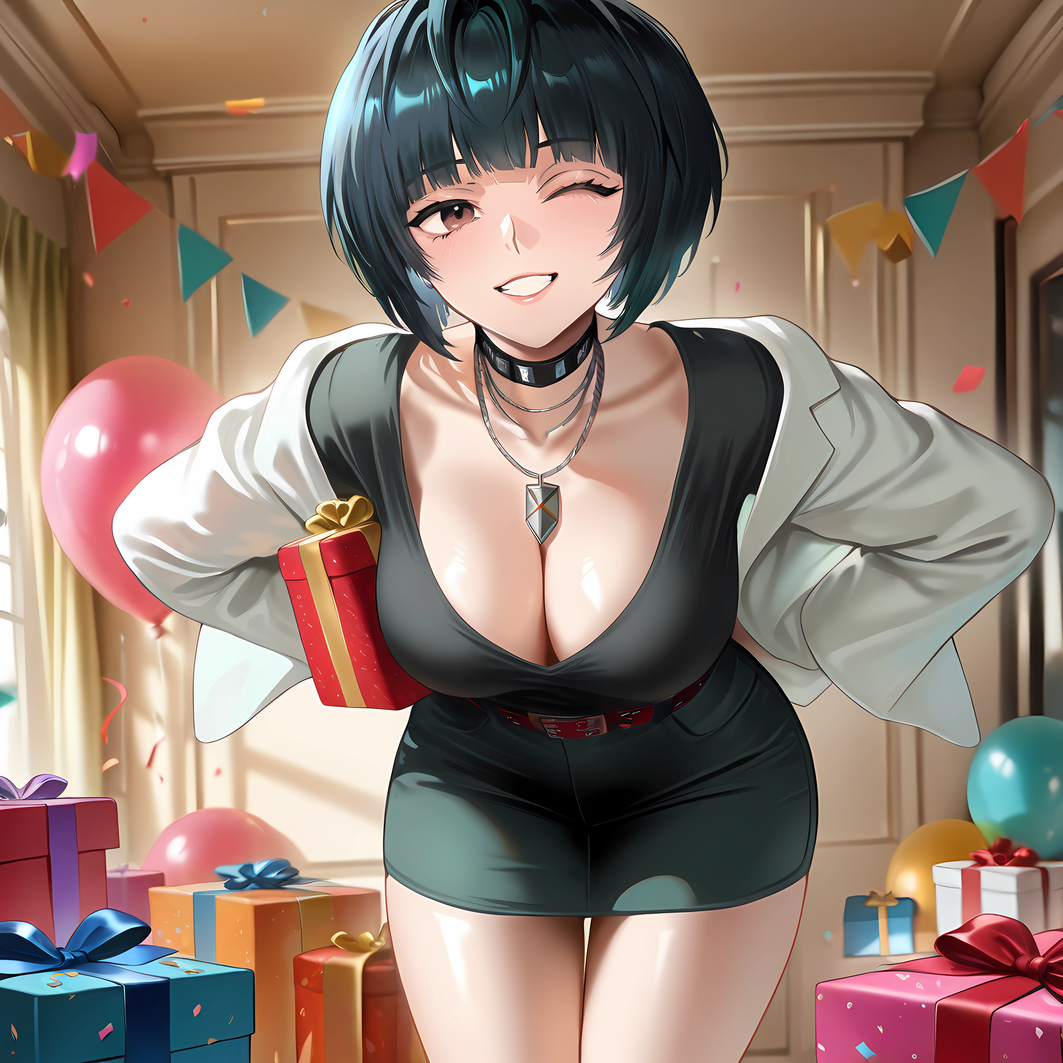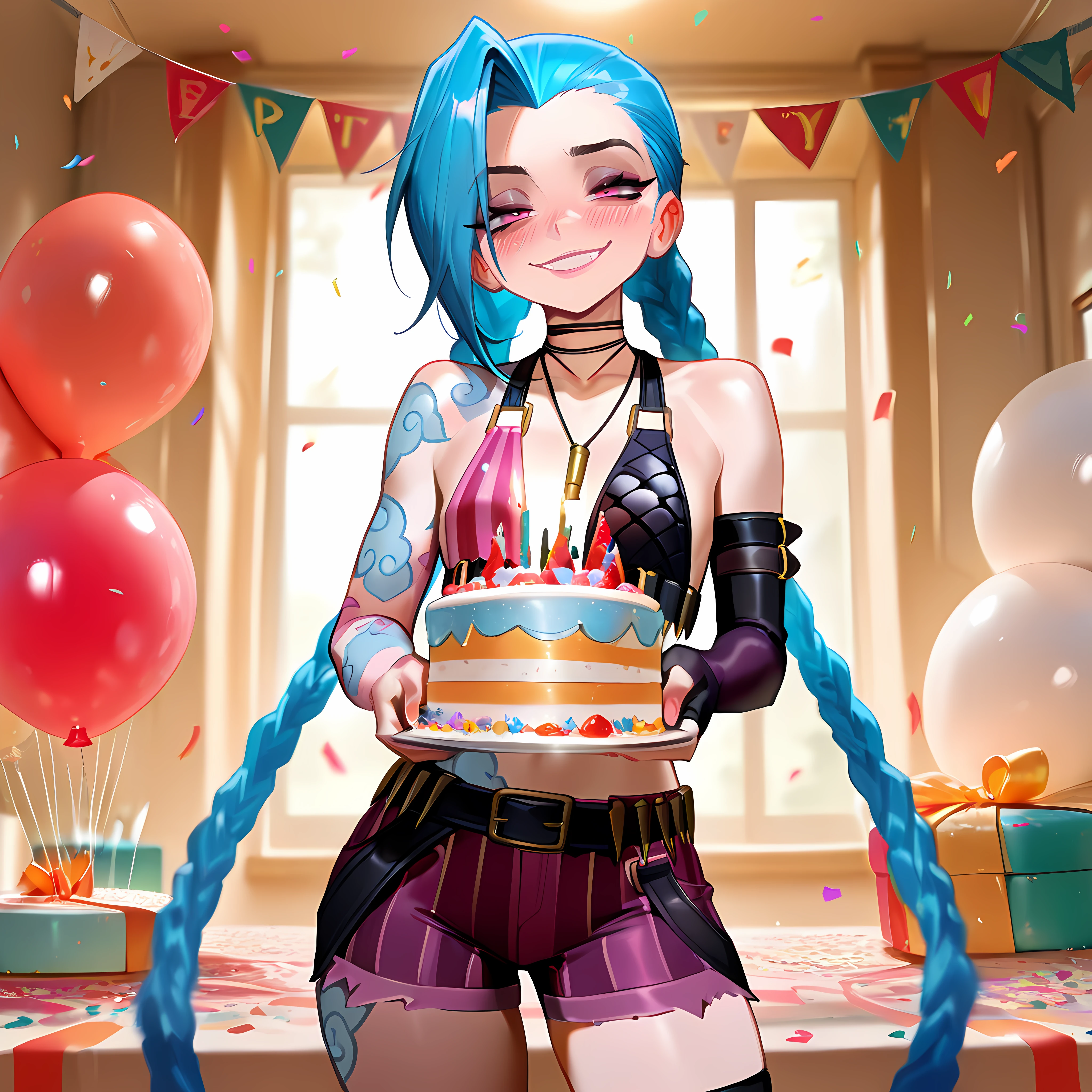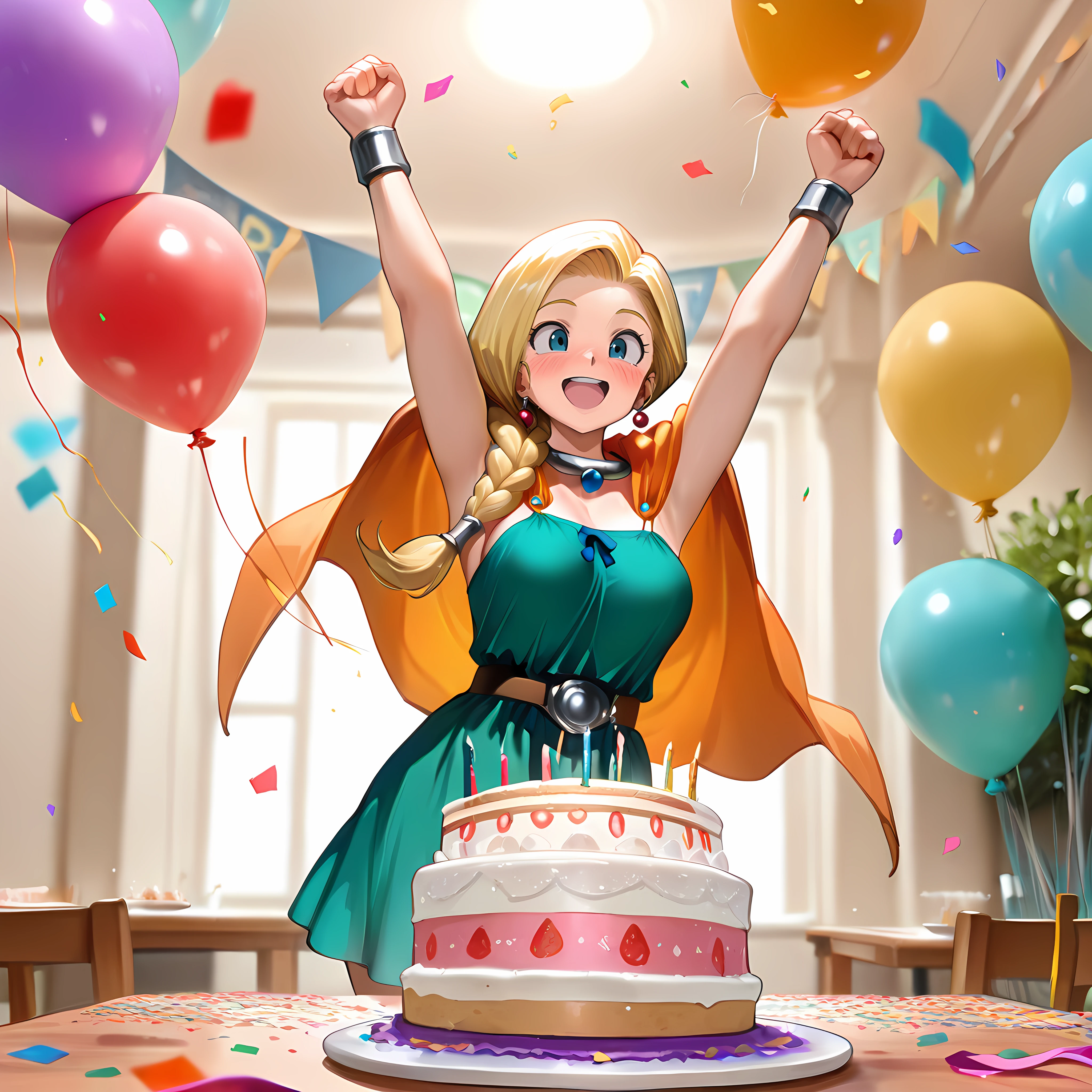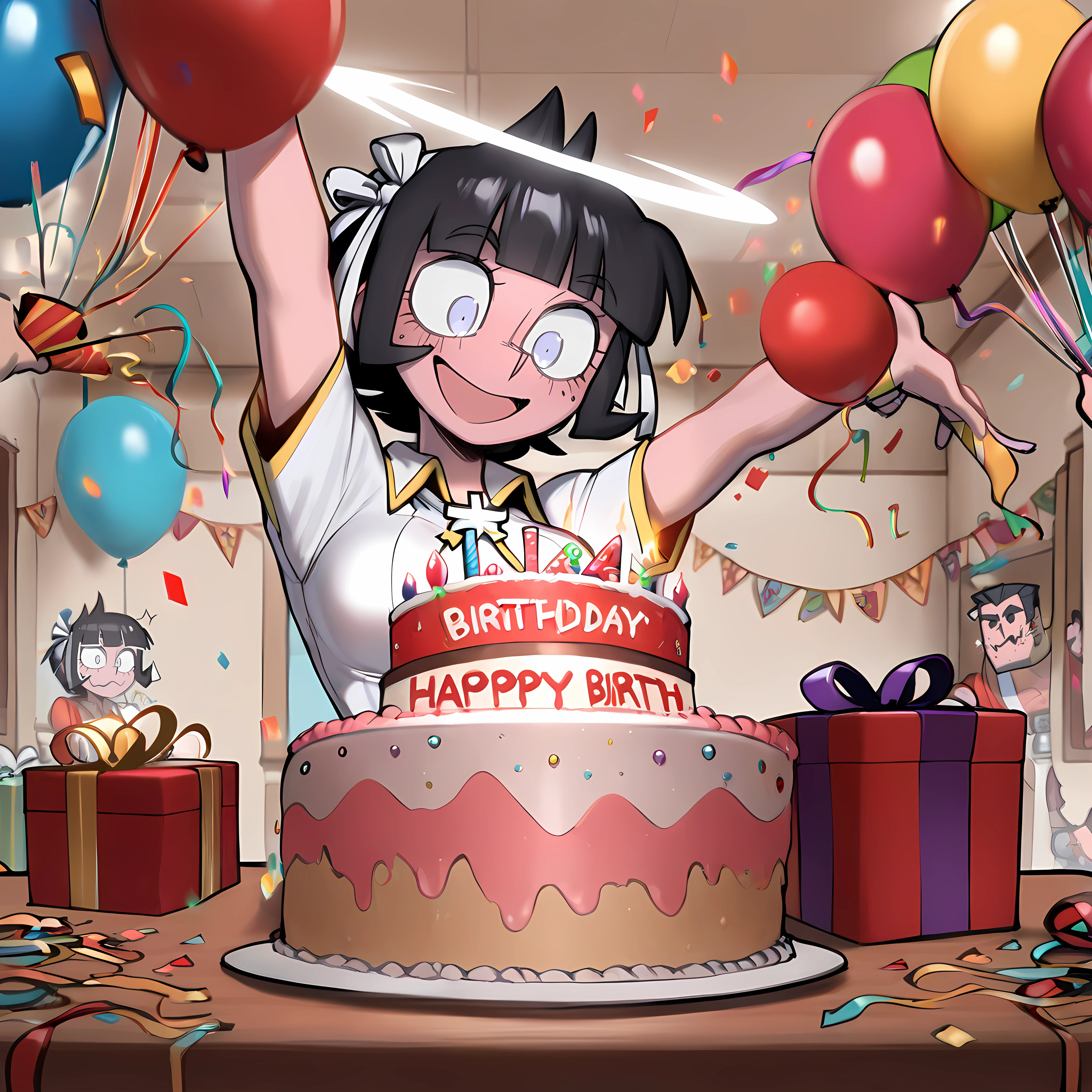birthday cake, confetti, indoors, food, balloon, string of flags, table, happy birthday, gift box, party popper