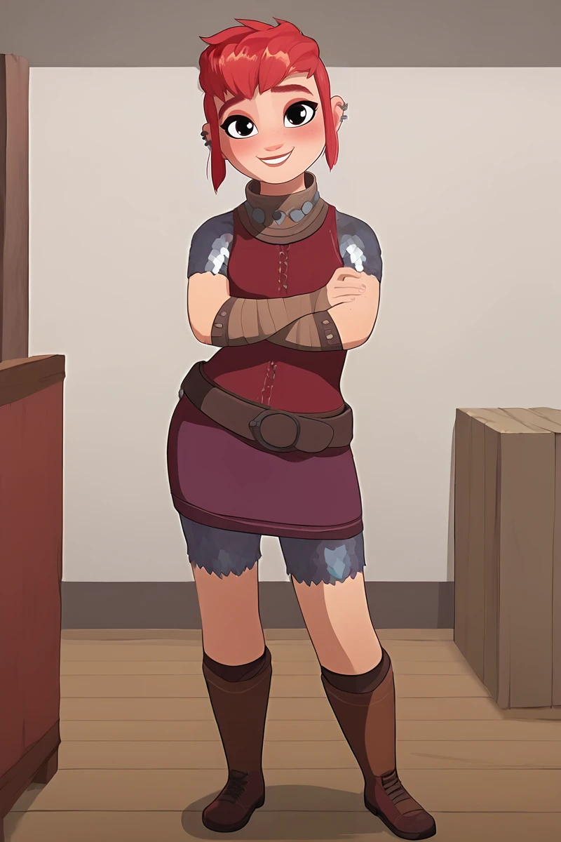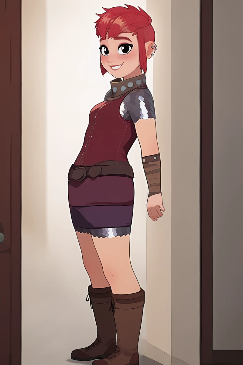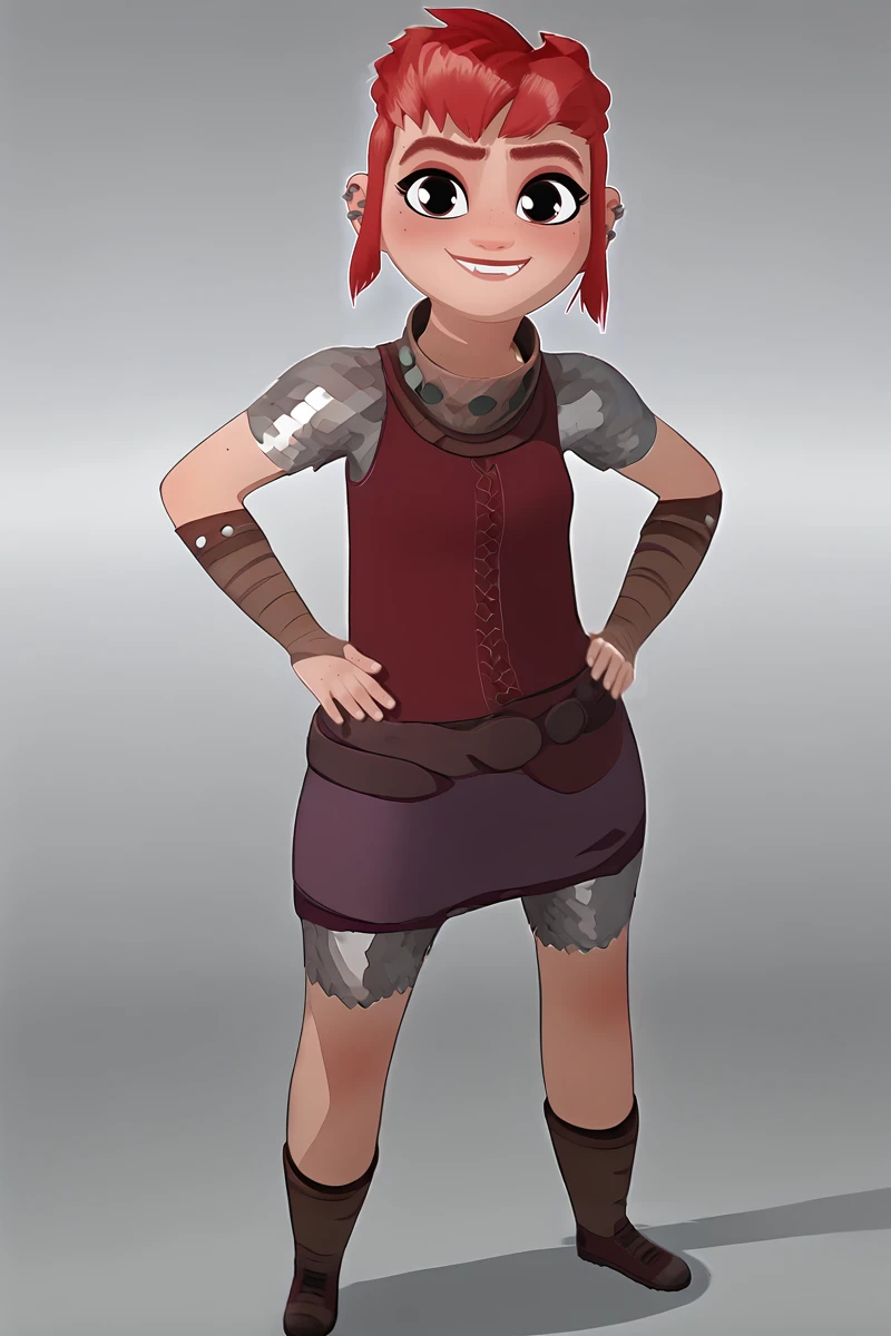 Base Prompt: 1girl, solo, black eyes, red hair, short hair, sidelocks, lips, piercing, earrings, ear piercing, freckles, thick eyebrows,