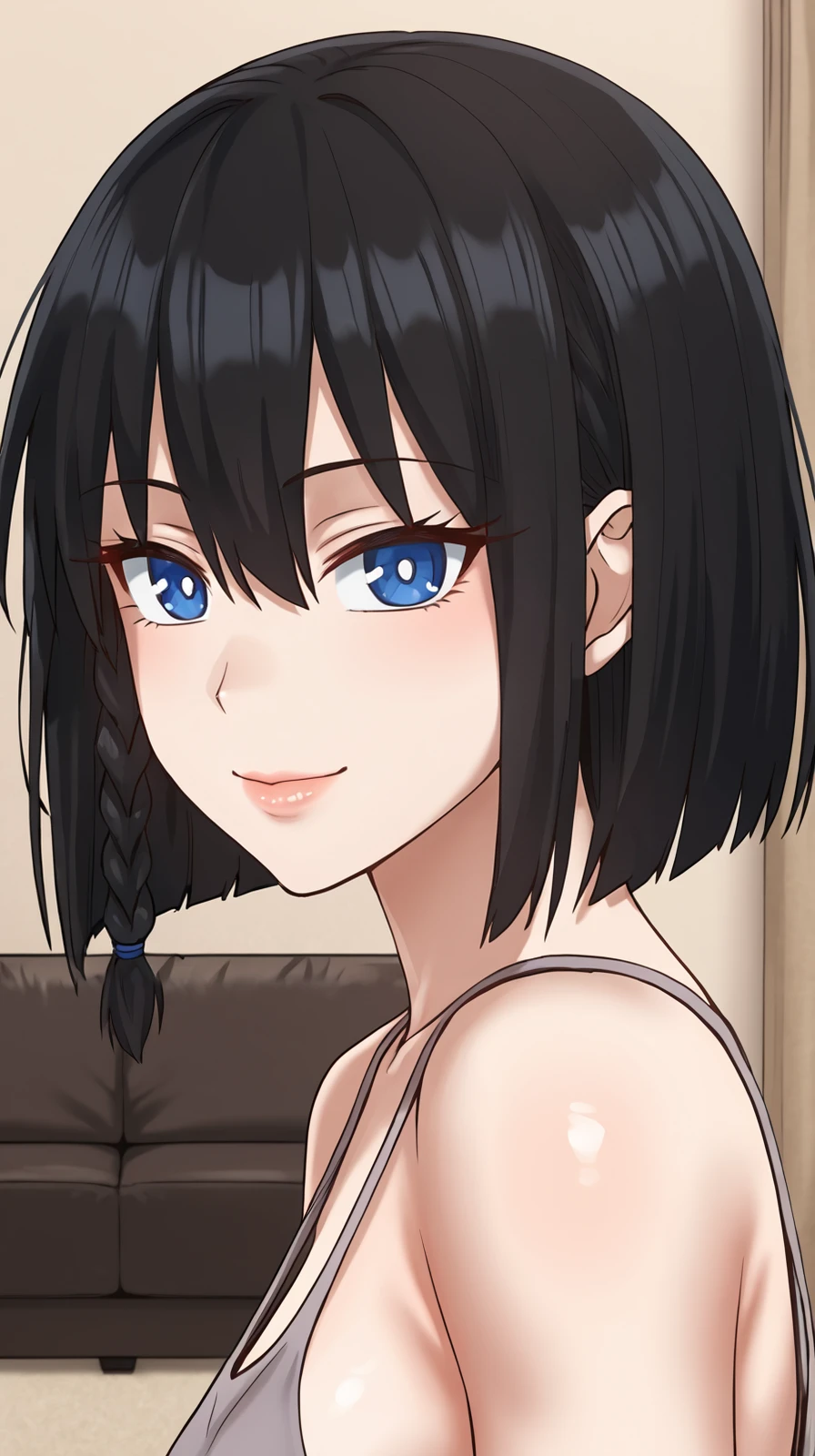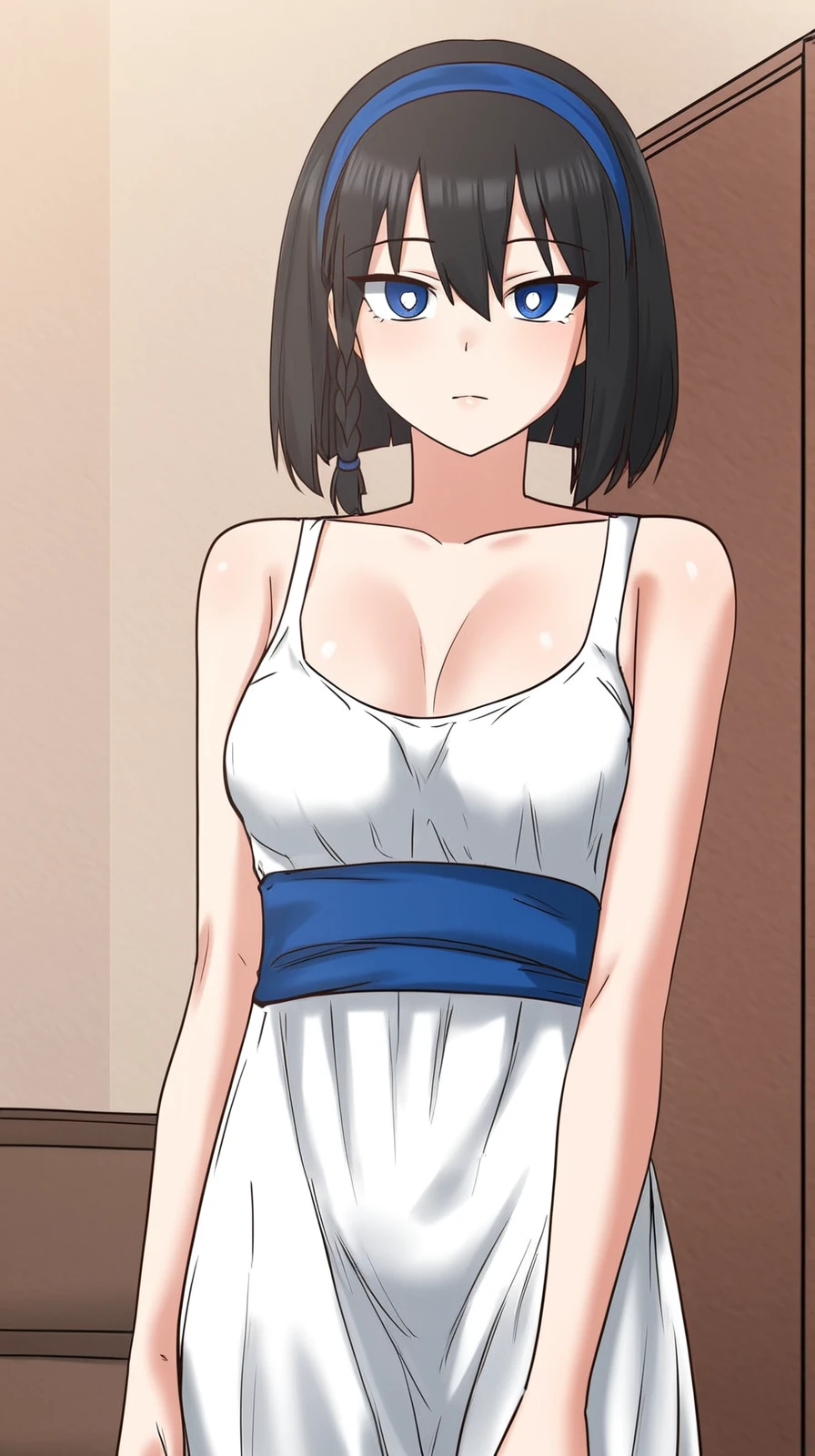 black hair, braid, side braid, short hair, blue hairband, blue eyes, white pupils, bangs, hair between eyes,