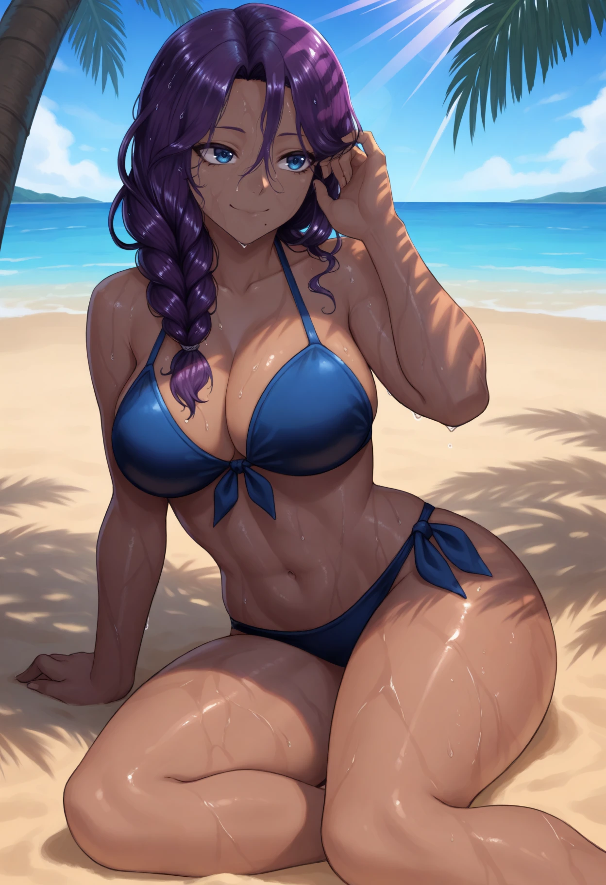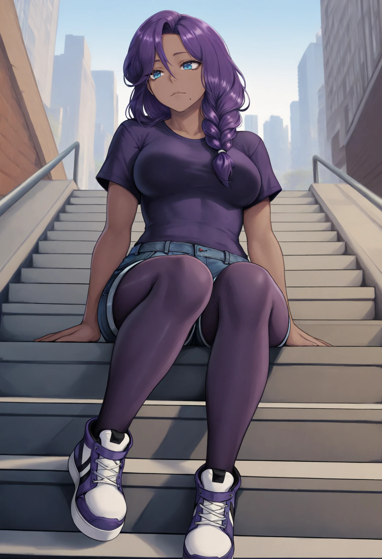 vm0m, blue eyes, mole under mouth, purple hair, long hair, braided ponytail, hair over shoulder, dark skinDefault outfit: