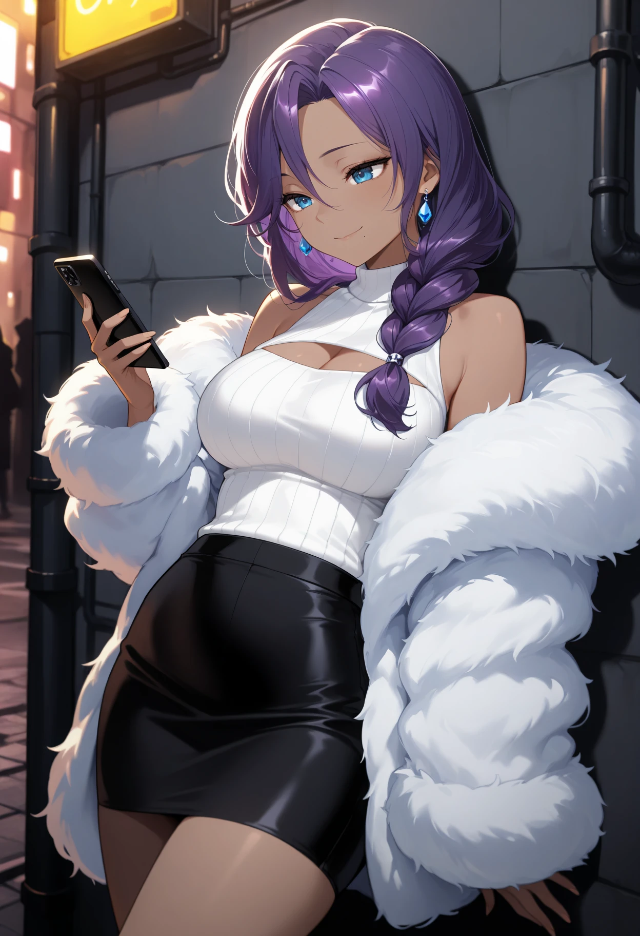 vm0m, blue eyes, mole under mouth, purple hair, long hair, braided ponytail, hair over shoulder, dark skin, earrings, white sweater, cleavage cutout, sleeveless sweater, fur coat, off-shoulder coat, white coat, black skirt, pencil skirtLet me know if you have any issues.